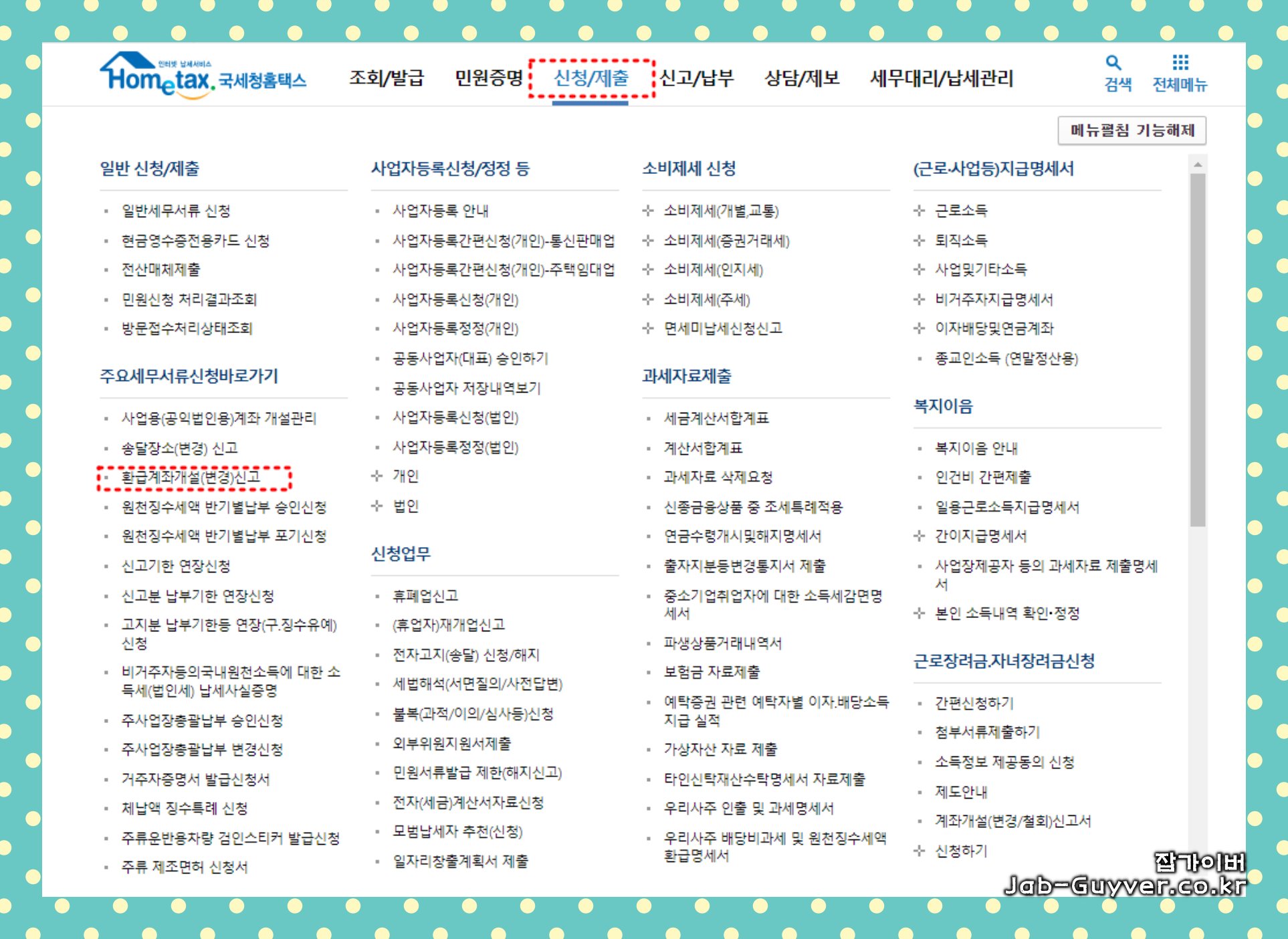 "신청/제출" 메뉴로 이동하여 "환급계좌개설(변경)신고"를 선택합니다.