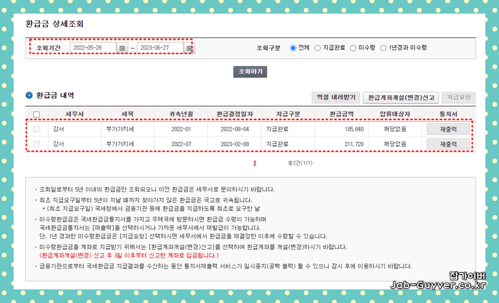 - 국세환급금통지서는 재출력을 선택하거나 가까운 세무서에서 재발급이 가능합니다.