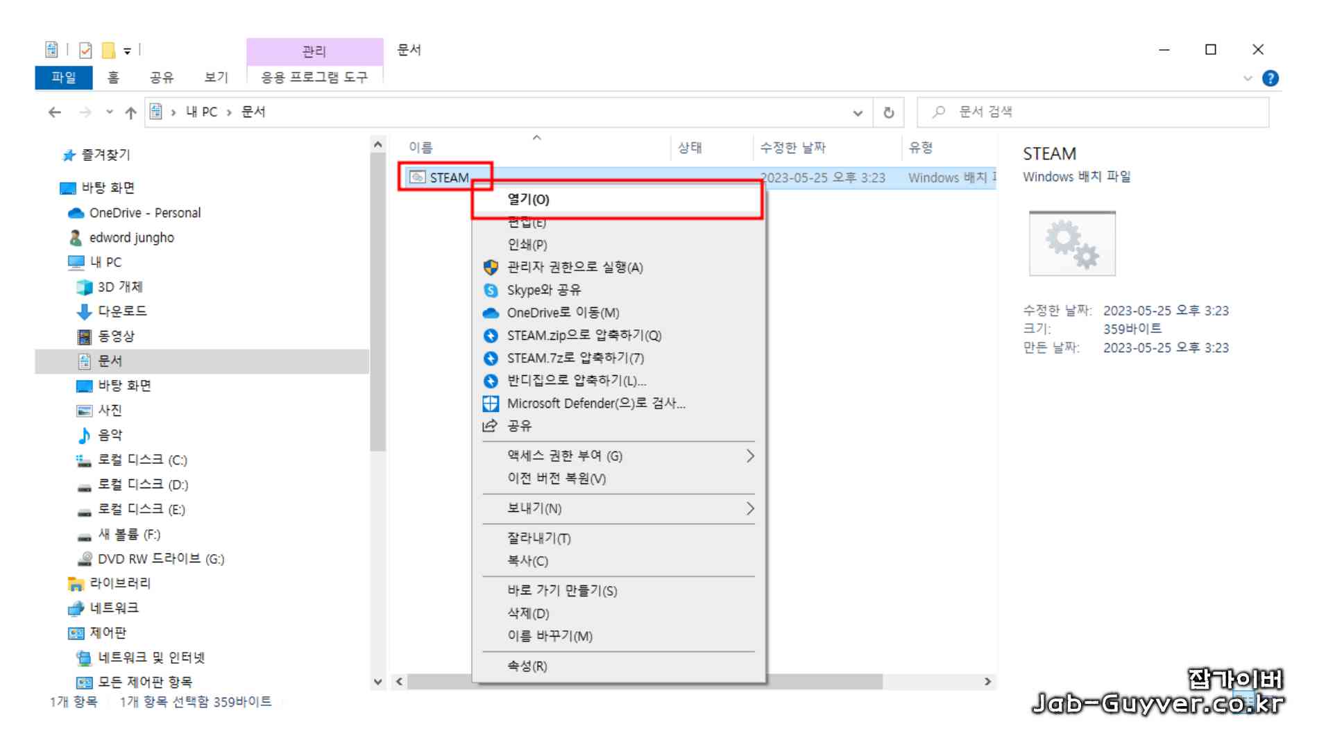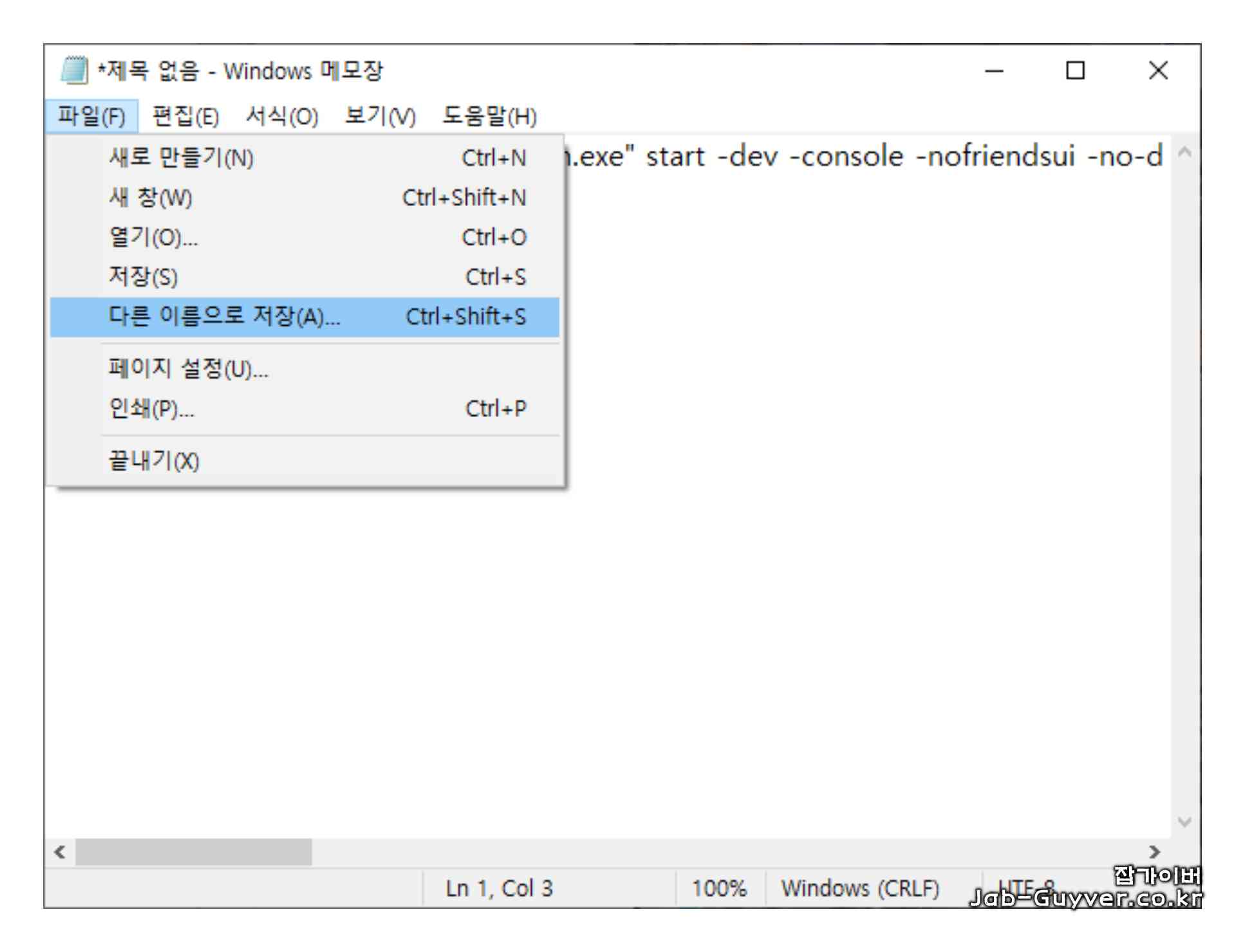 위에서 복사한 명령어를 저장하고자 하는 경로에 “steam.bat“와 같은 이름으로 저장합니다. 예를 들어, “C:\Steam” 폴더에 저장하려면 “C:\Steam\steam.bat”로 저장합니다.