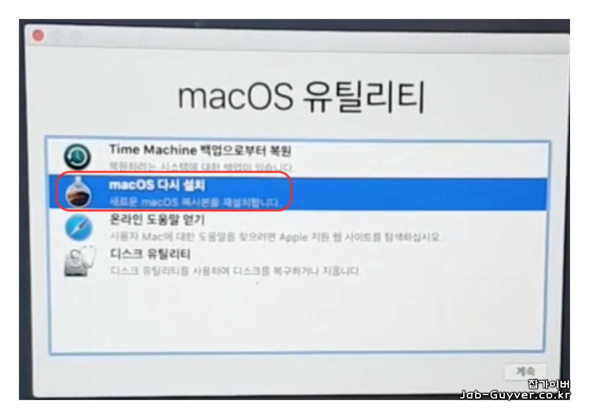 이상 맥북 파티션을 모두 삭제했다면 "디스크 유틸리티"를 종료 후 MacOS 유틸리에서 MacOS 다시설치를 통해 맥북 운영체제를 새로 설치합니다.