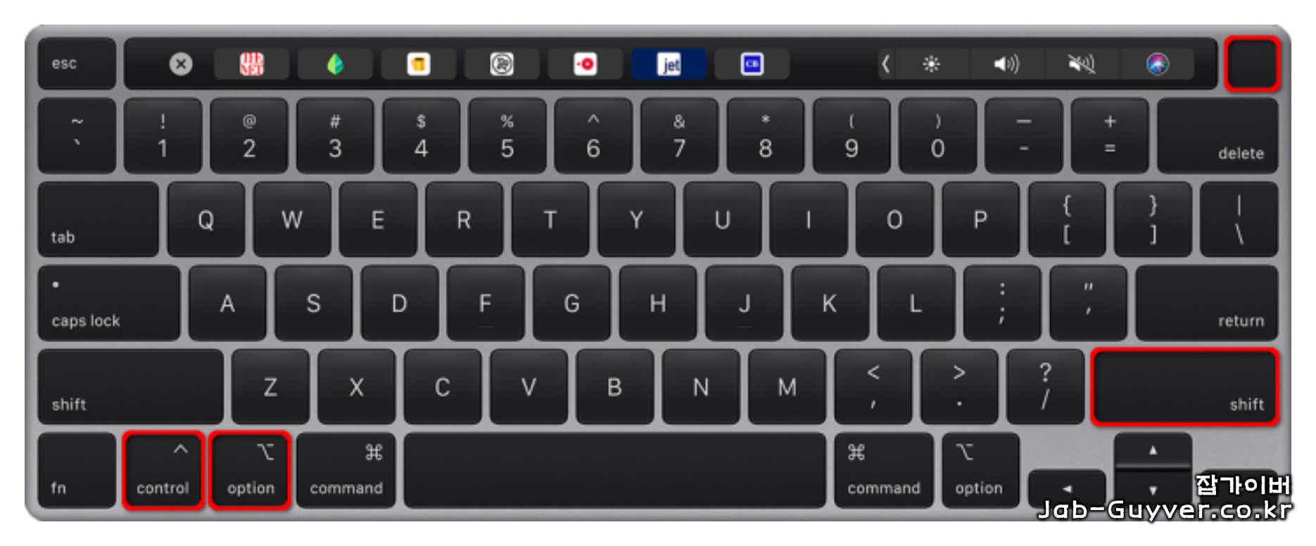 맥 키보드에 있는 Shift(⇧) + Control(⌃) + Option(⌥) 키를 동시에 누른 상태로 전원 버튼을 누르고 있습니다. 이 단계에서는 이전 세 단축키를 모두 누른 채로 전원 버튼을 누르고 있어야 합니다.
