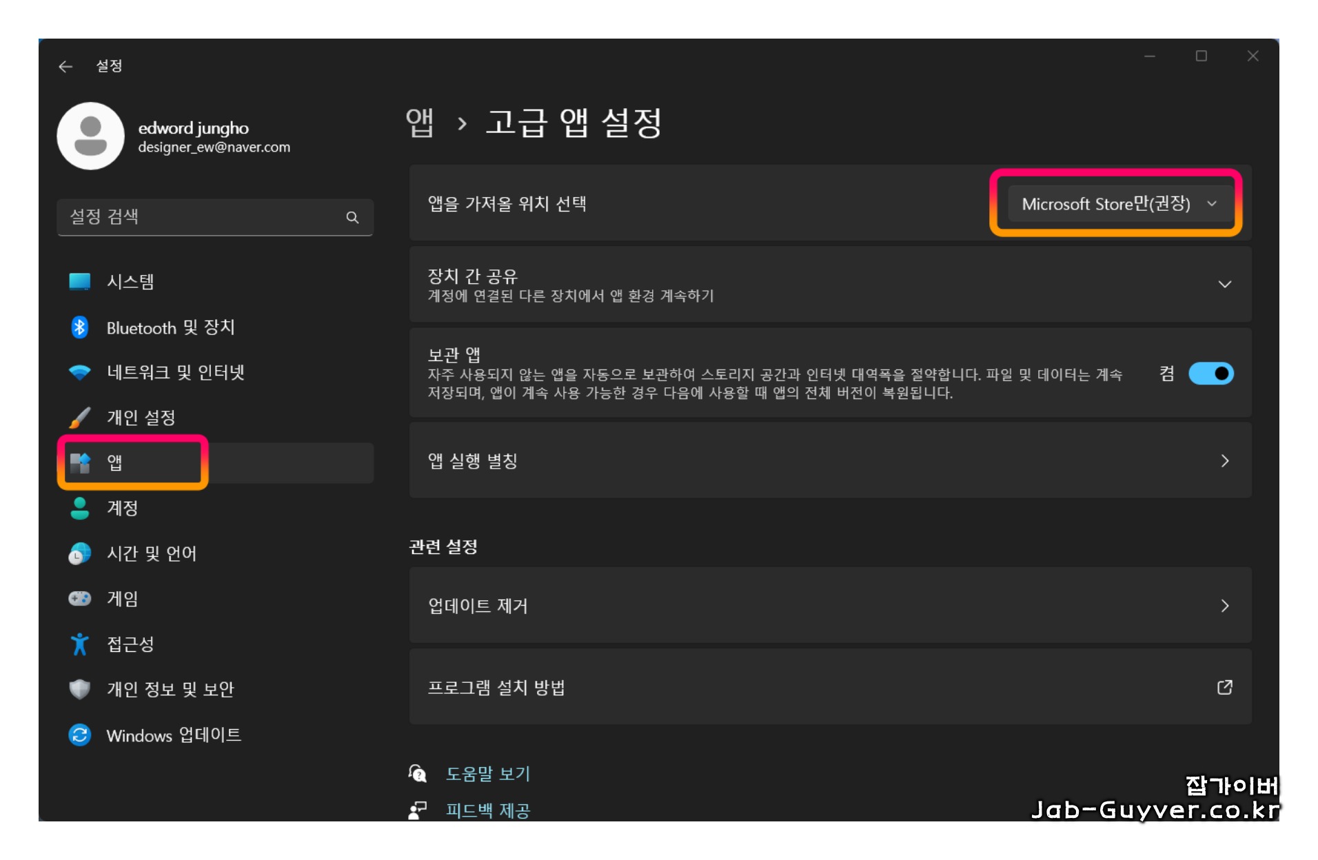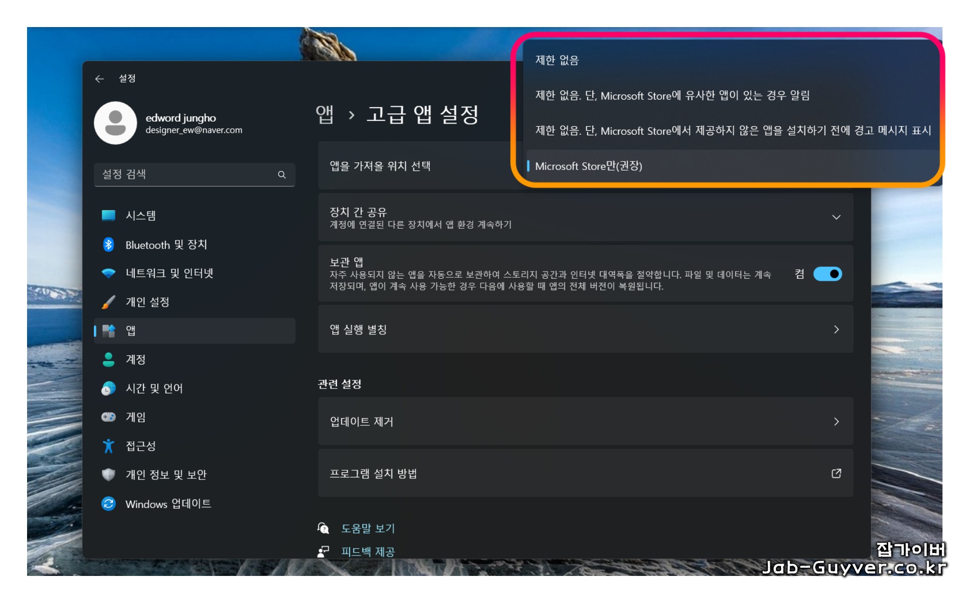 앱을 가져올 위치선택에서 Microsoft Store만 (권장)으로 체크되어 있습니다.