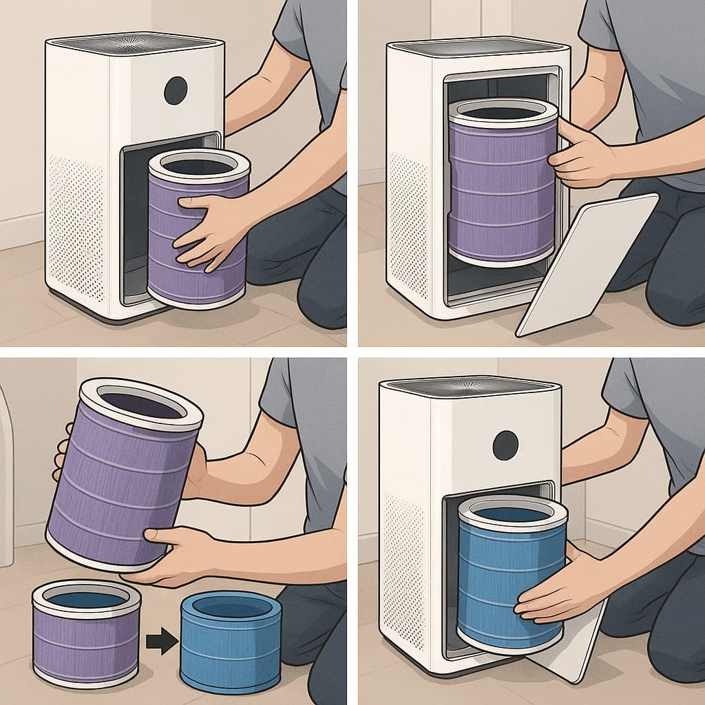 프리필터, HEPA 필터, 탈취 필터 등이 포함될 수 있으며 프리필터는 매달 2회 정도 청소해야 하며, HEPA 필터 및 탈취 필터는 6개월에서 1년에 한 번씩 교체해야 합니다.
