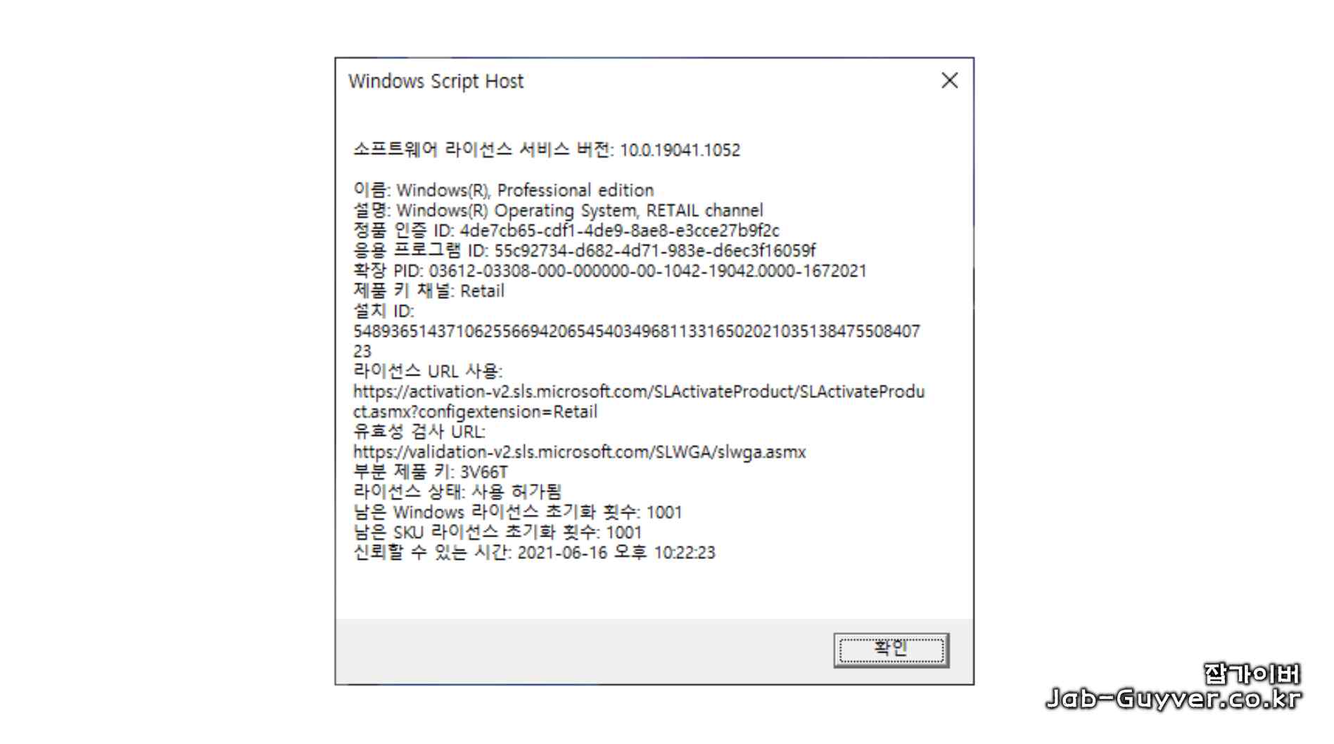 위의 방법을 사용하여 윈도우 소프트라이센스 정보를 확인할 수 있습니다. SIMGR/DVI 명령어는 다른 용도의 정보에 사용되므로, 윈도우 소프트라이센스 정보를 알려주지 않습니다.
