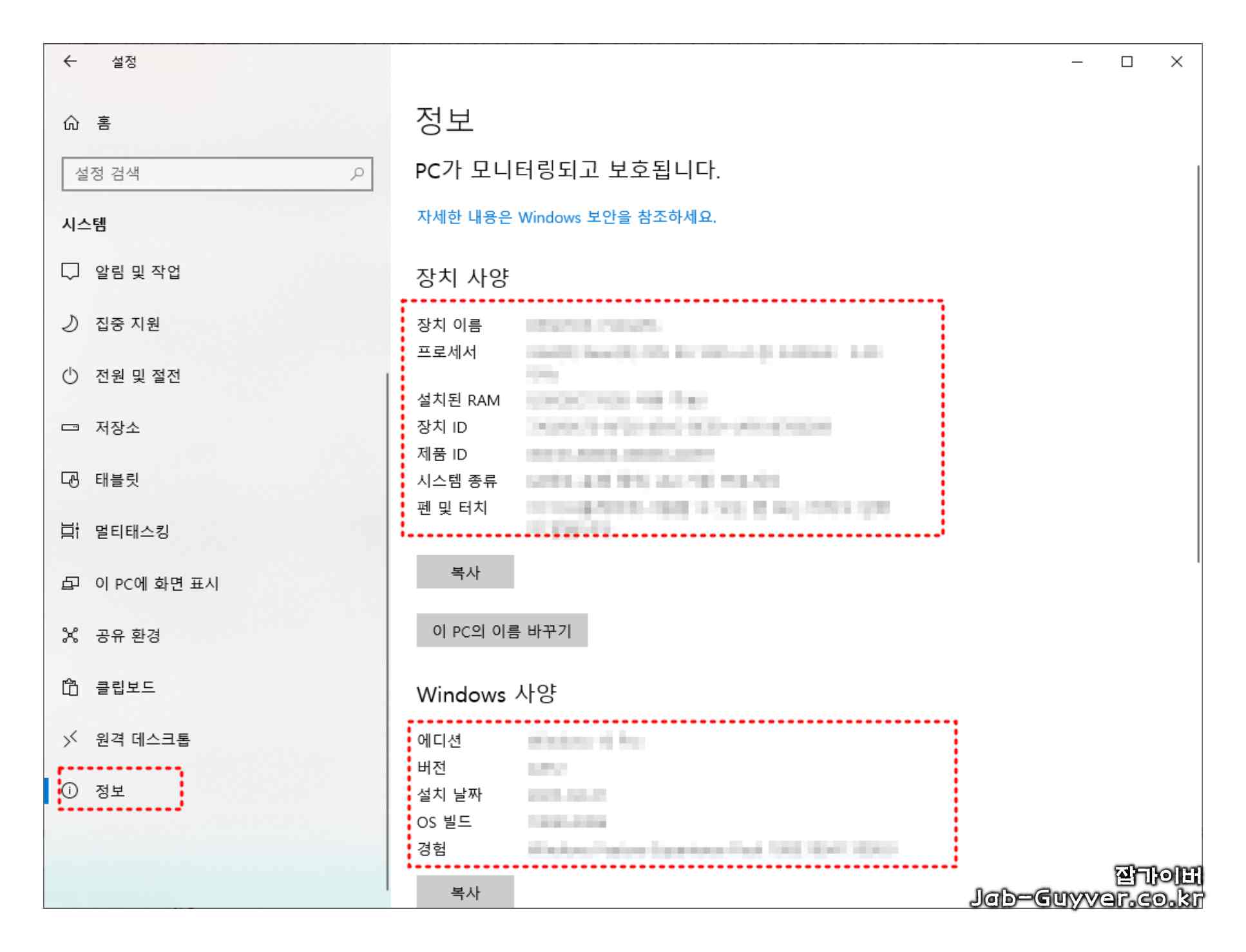 - 정보 확인: "시스템" 탭에서 현재 설치된 윈도우 설치된 버전정보와 PC 이름을 확인할 수 있습니다.