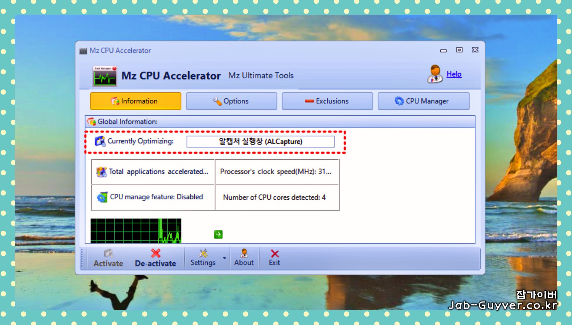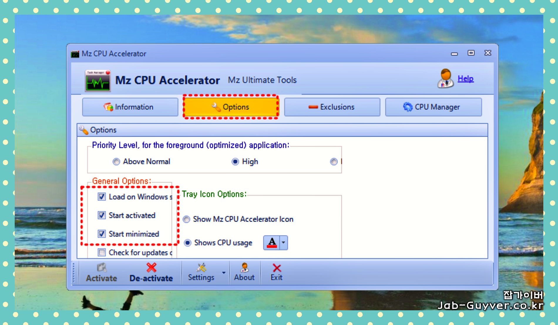 옵션탭으로 이동하면 윈도우 부팅 시 자동으로 실행하도록 설정할 수 있으며 CPU 최적화 충돌나거나 비활성하하고 싶다면 De-Activate로 최적화를 꺼줍니다.