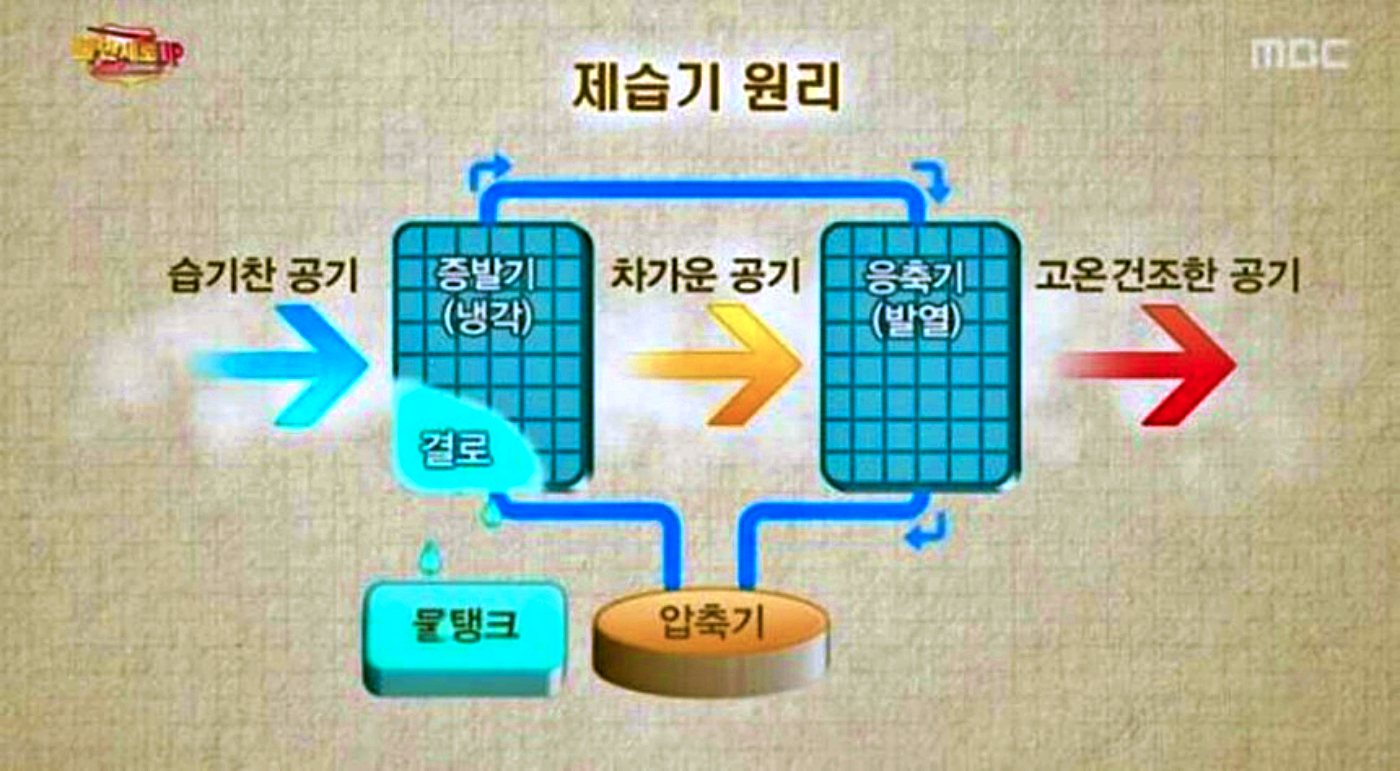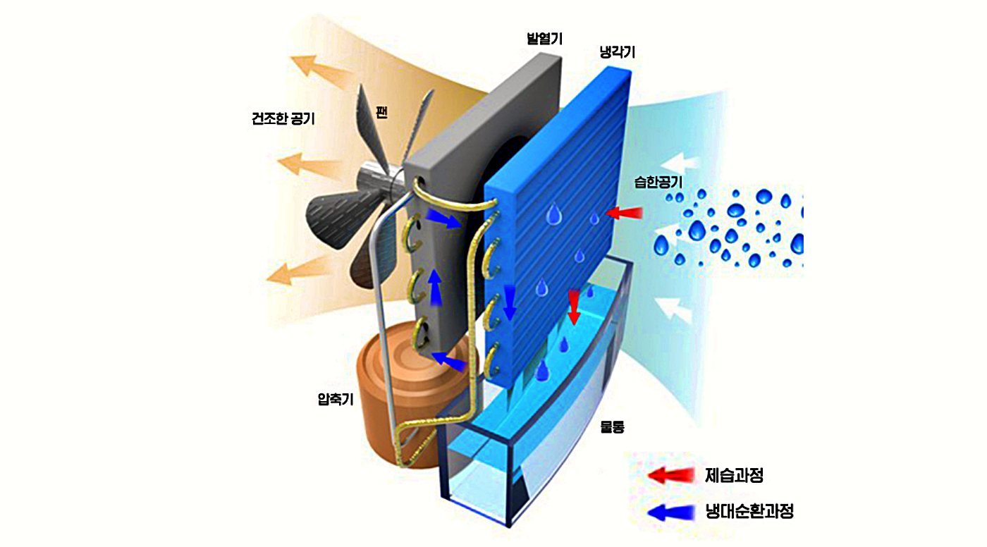 • 수분이 빠진 공기는 다시 응축 코일을 지나 미지근하게 데워져 실내로 돌아간다.