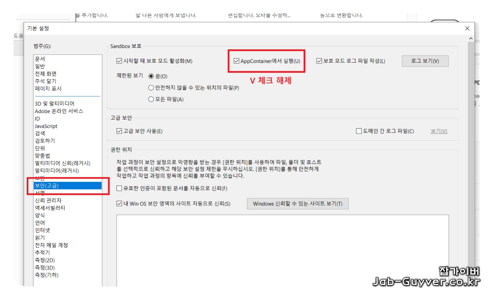 이렇게 보호 모드 사용을 비활성화하면 제한된 보기 및 AppContainer도 비활성화되어 PDF 파일이 정상적으로 열리게 됩니다.