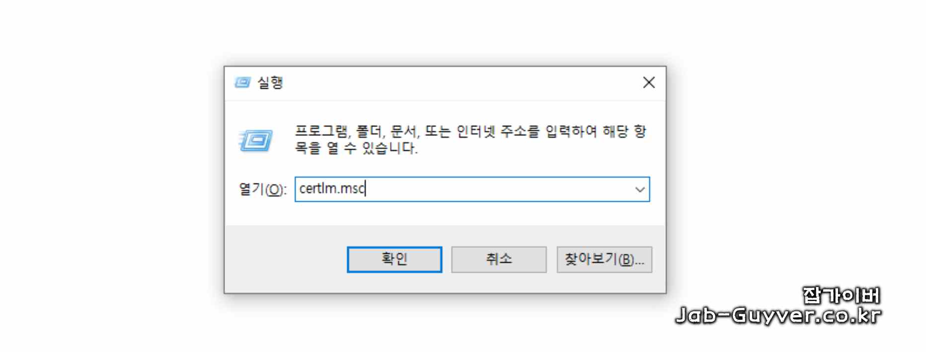 "certlm.msc"를 입력하고 확인 버튼을 클릭합니다.