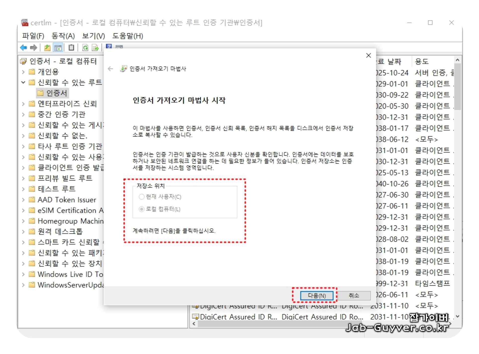 윈도우11 SSL 보안인증서 가져오기 설치방법