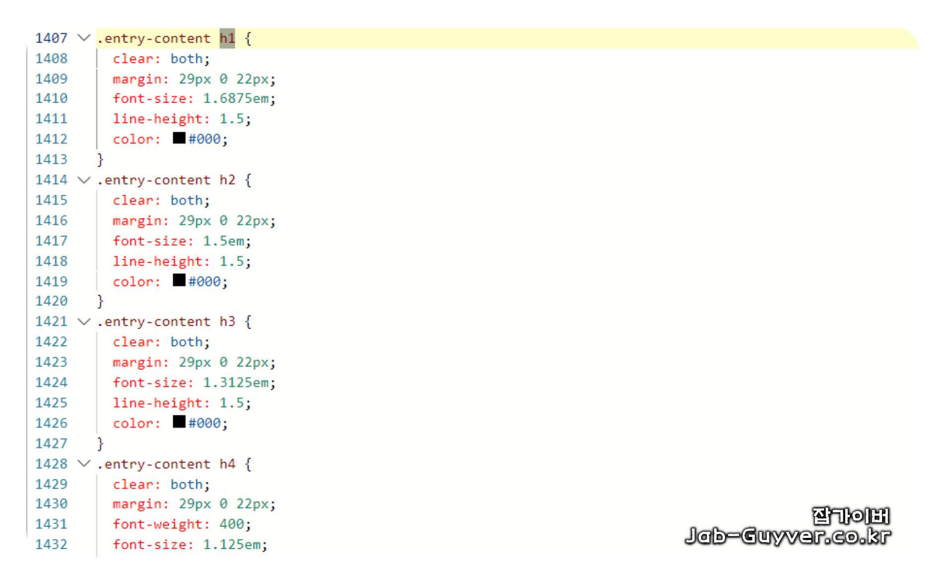 본문 제목의 글씨 크기와 폰트를 변경하기 위해 앞서 설명한 방법과 크게 다르지 않으며 각각의 제목에 해당하는 코드를 찾아서 폰트 크기와 폰트 스타일을 수정합니다.
