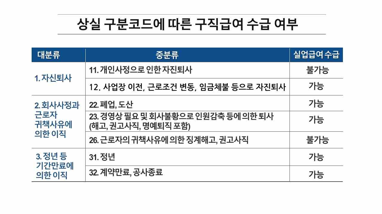 | 3. 정년 등 기간만료에 의한 이직 | 26. 근로자의 귀책사유에 의한 징계해고, 권고사직 | 신청불가 |