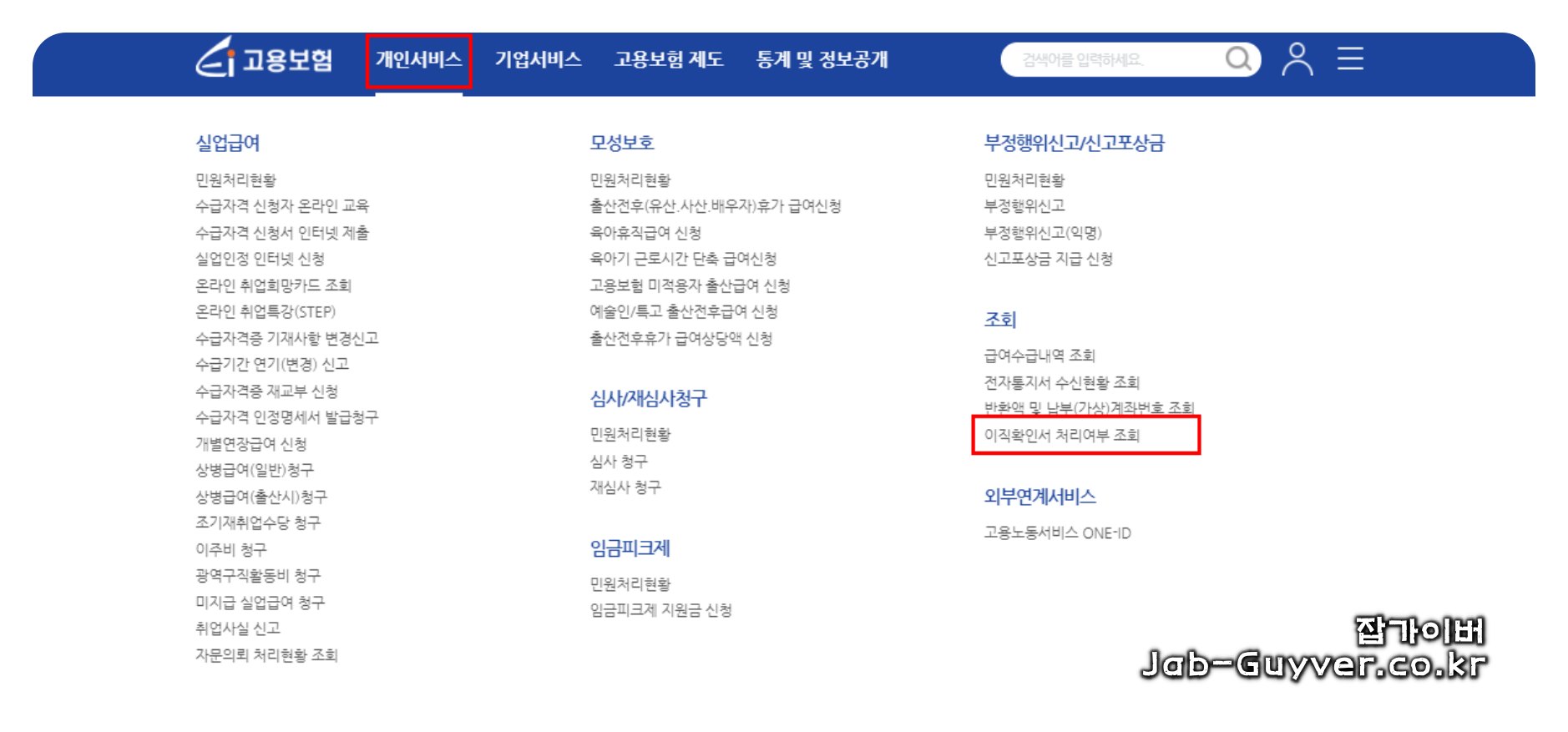 고용보험 메인화면에서 "개인서비스"를 선택한 후, "이직확인서 처리 여부 조회"를 클릭합니다.