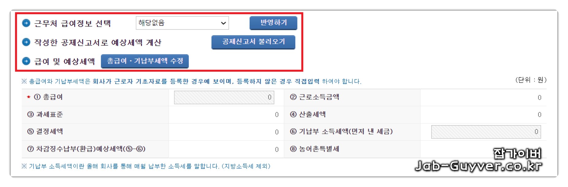 근무처 급여정보 선택에서 자료를 반영하거나 공제신고서를 불러옵니다. 등록되지 않은 경우, 총급여와 기납부세액을 수정할 수 있습니다.