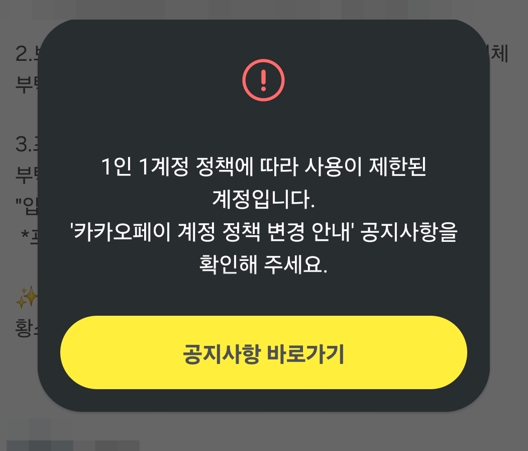 카카오페이 1인 1계정 - 중복가입 불가 이미 가입된 계정