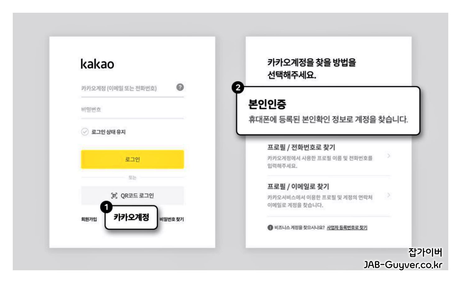 참고1. 카카오계정을 찾는 방법이 필요한 경우: 카카오계정 페이지에서 '본인인증(휴대폰 인증)' 방식으로 계정 찾기를 진행해 주세요.