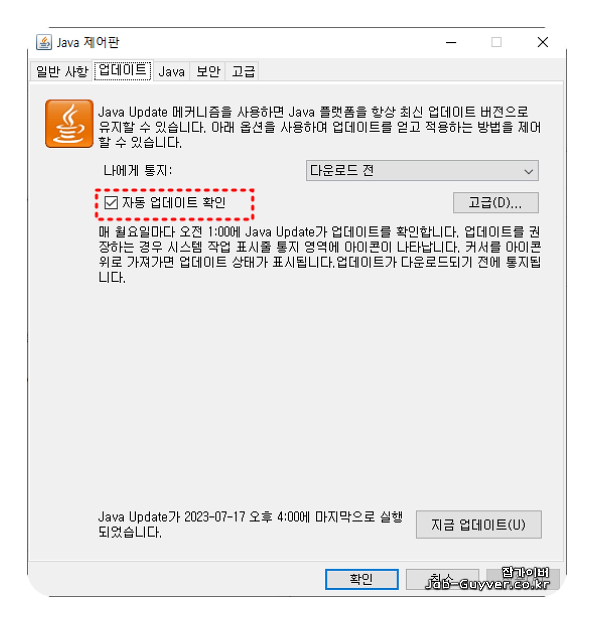 자바 업데이트 알림 끄는 방법
