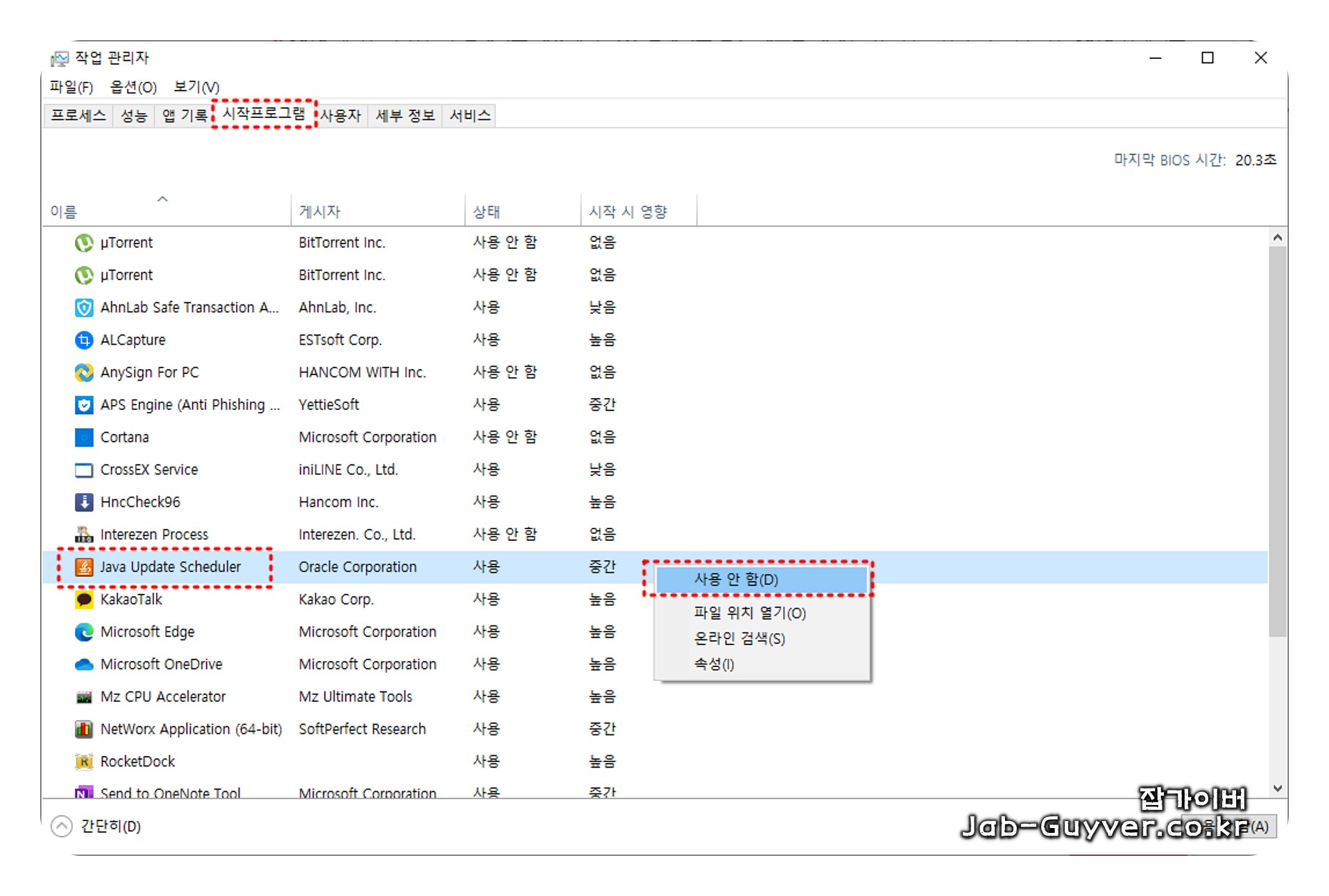 "시작프로그램" 탭에서 "Java Update Scheduler"를 클릭하고 "사용 안 함" 버튼을 누릅니다.