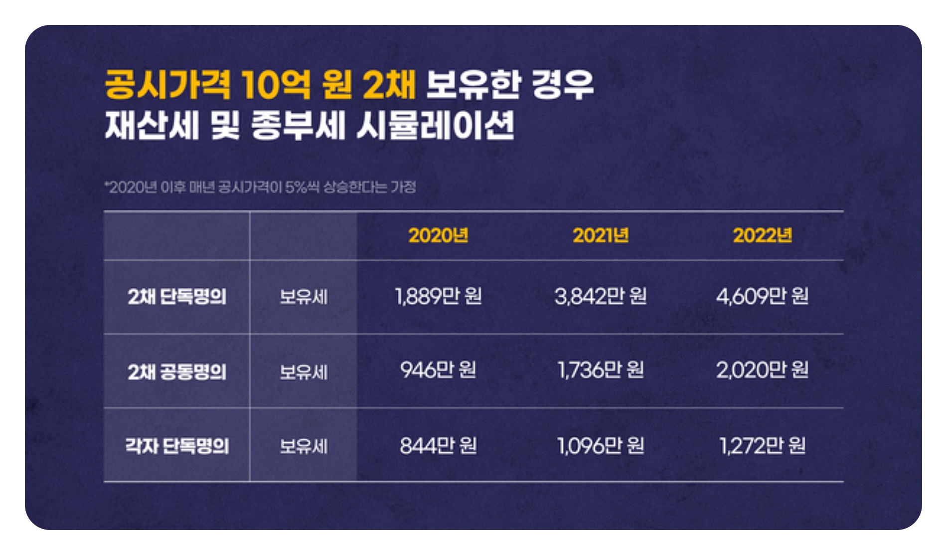 총 세액 자체는 동일하지만, 공동명의는 인별 고지되어 각자 나눠 납부하므로 1인당 세 부담이 낮아진다는 인식 효과가 있습니다.