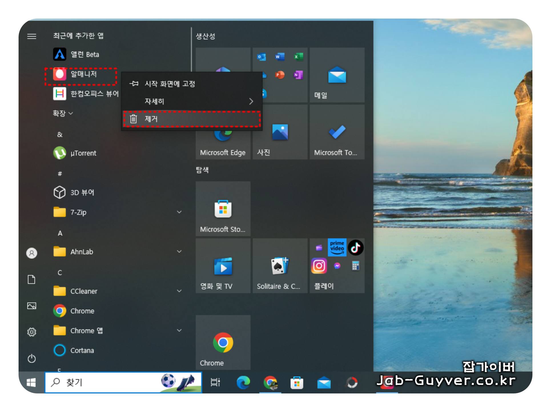 윈도우 로고를 선택 후 알매니저를 마우스 우클릭 제거를 눌러줍니다.