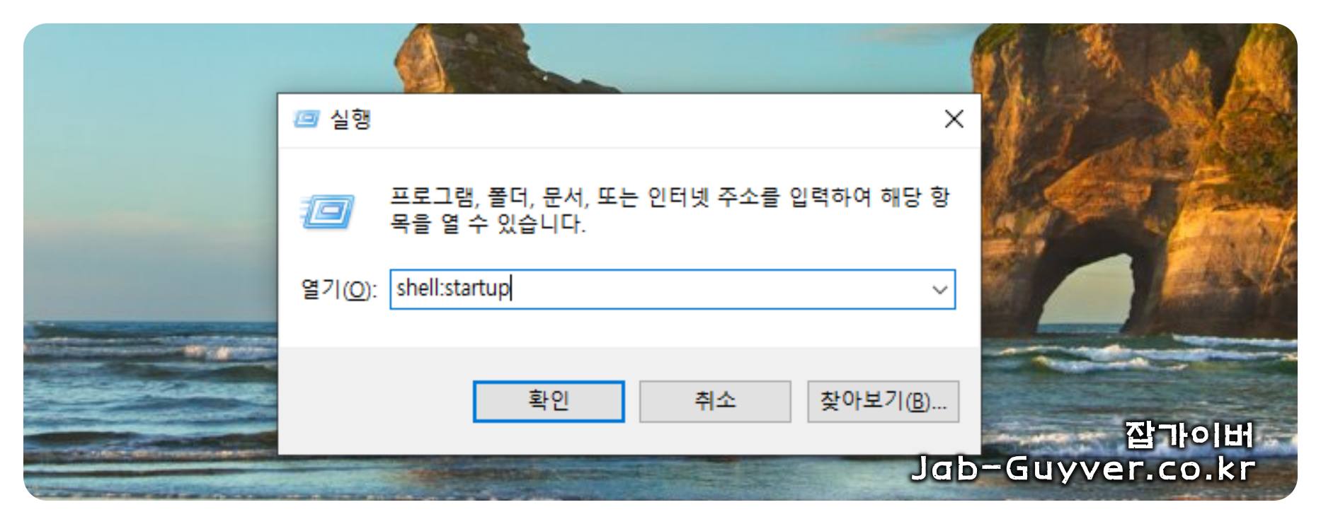 윈도우 키 + R을 눌러 Shell:startup 입력 후 확인을 눌러줍니다.