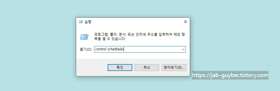 Win + R을 눌러 실행 창을 열고 control schedtasks를 입력하여 작업 스케줄러를 엽니다.