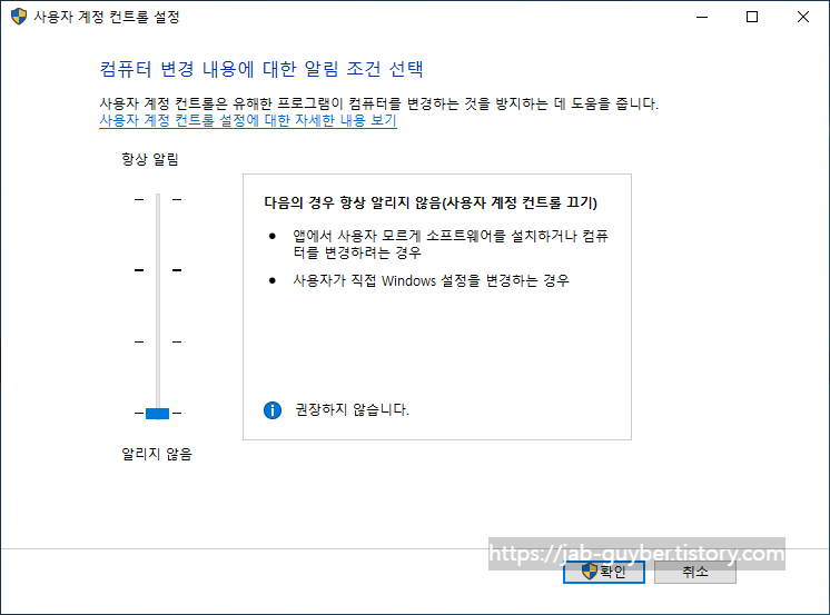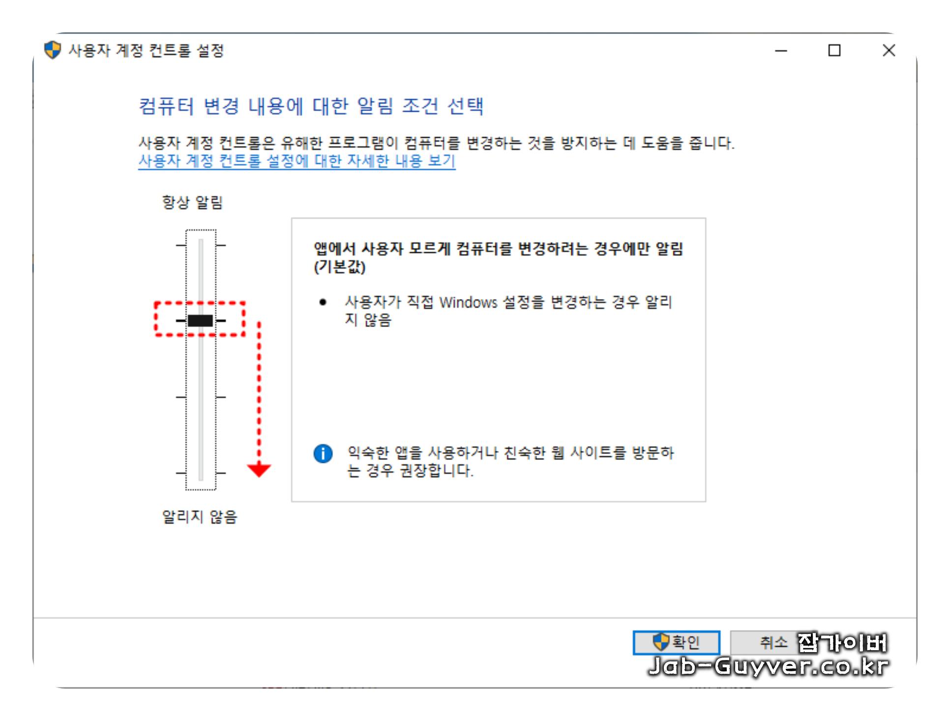 윈도우11 알림끄기 - 사용자계정 컨트롤 설정 3가지 윈도우 보안을 위해서 윈도우 설정이 변경되는 경우 변경을 할것인지 다시 한번 묻는 알림이 실행되는데 이러한 알림은 인터넷을 하면서도