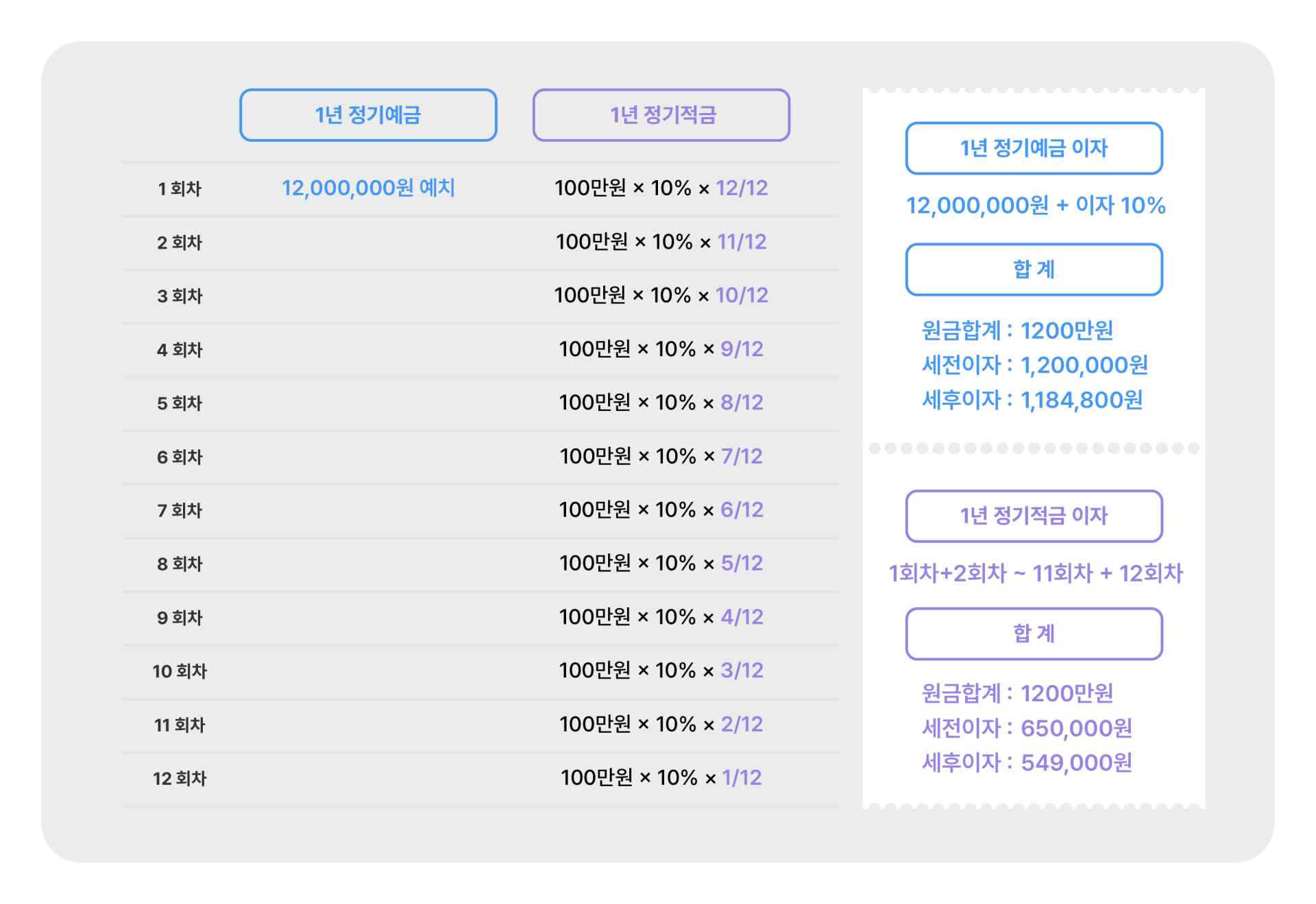 예를 들어 1-11 선납이연 방식은 첫 달에 100만원을 납입하고, 일곱 번째 달에는 1100만원을 납입하는 방식입니다. 이렇게 하면 만기일과 이자는 똑같이 유지되지만, 첫 달에 남는 1100만원을 다른 예금 상품에 예치해 이자를 추가로 얻을 수 있습니다.