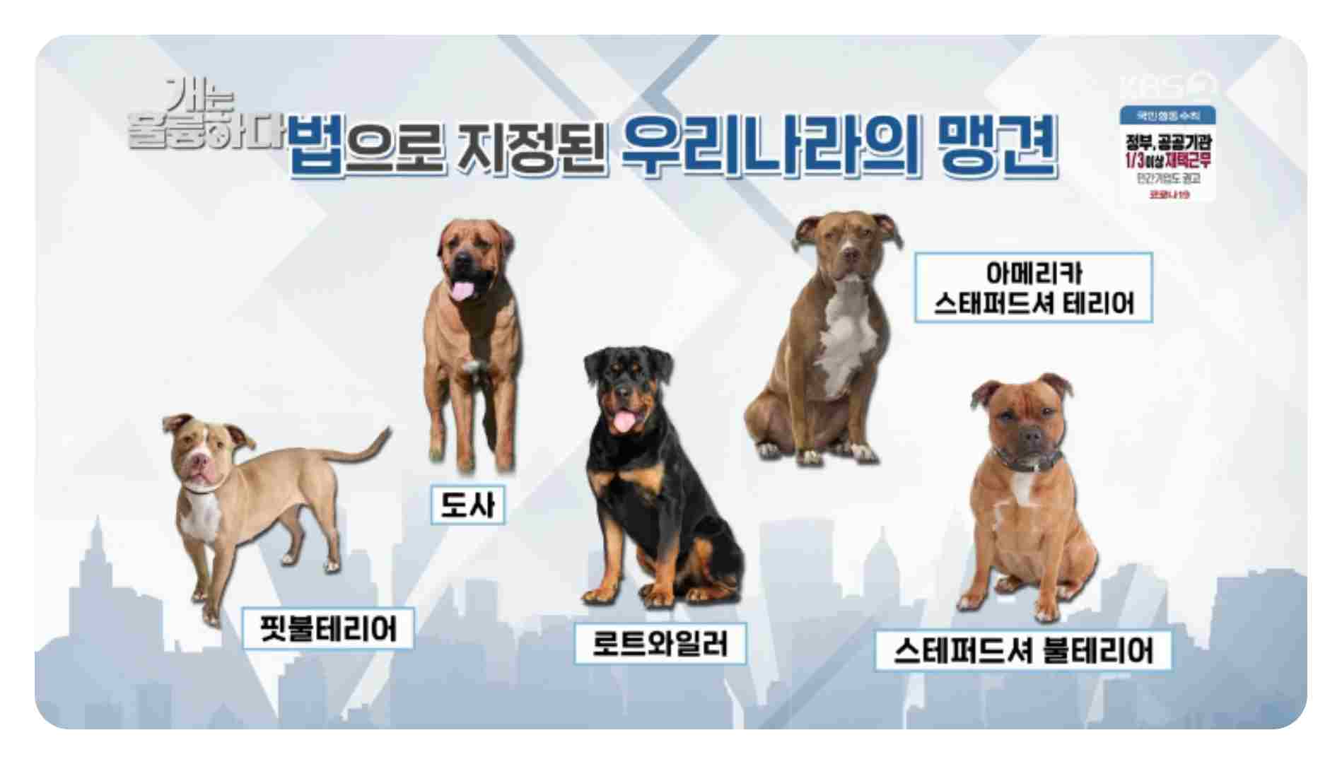5대 맹견으로 알려진 로트와일러, 도사견, 아메리칸 핏불테리어, 아메리칸 스태퍼드셔 테리어, 스태퍼드셔 불테리어의 경우, 생후 3개월 이상인 경우 목줄과 입마개를 착용한 후 외출해야 합니다.
