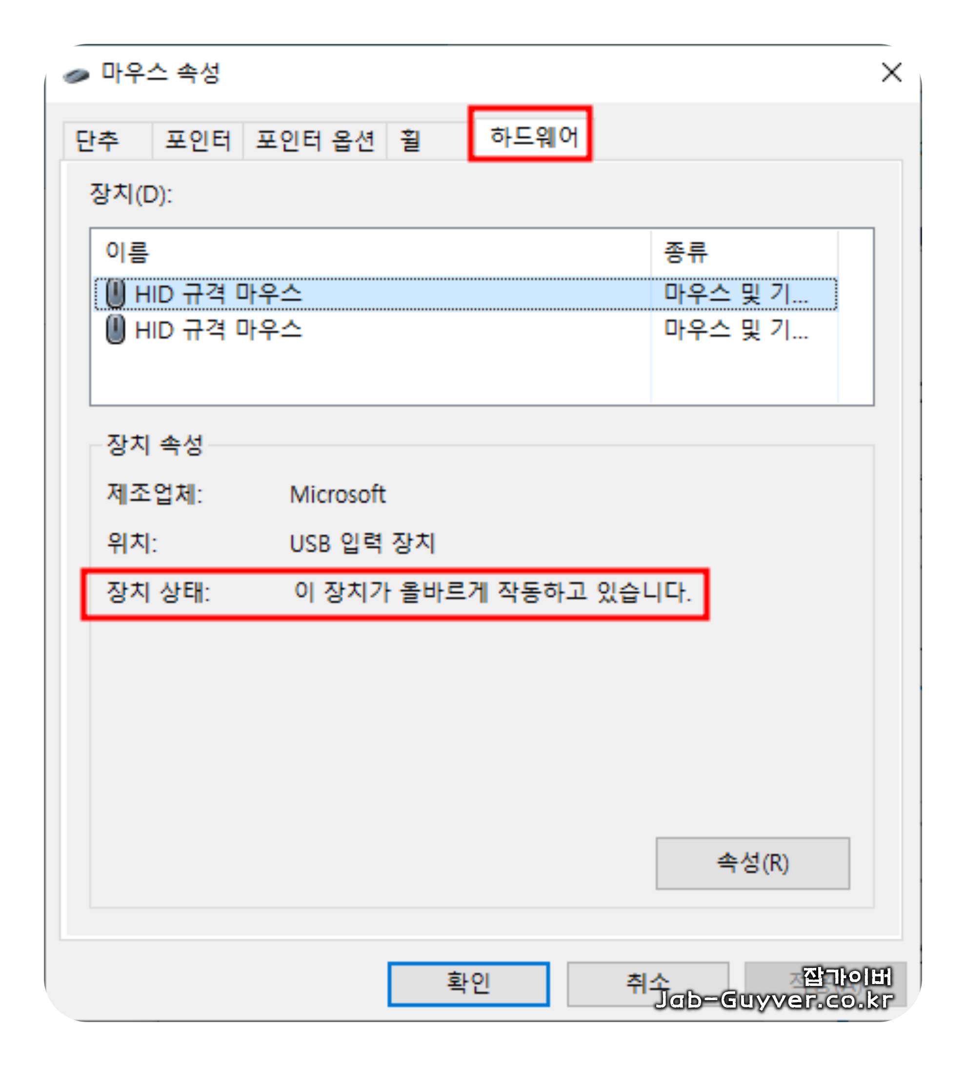마우스 속성에서 하드웨어 > 속성 클릭