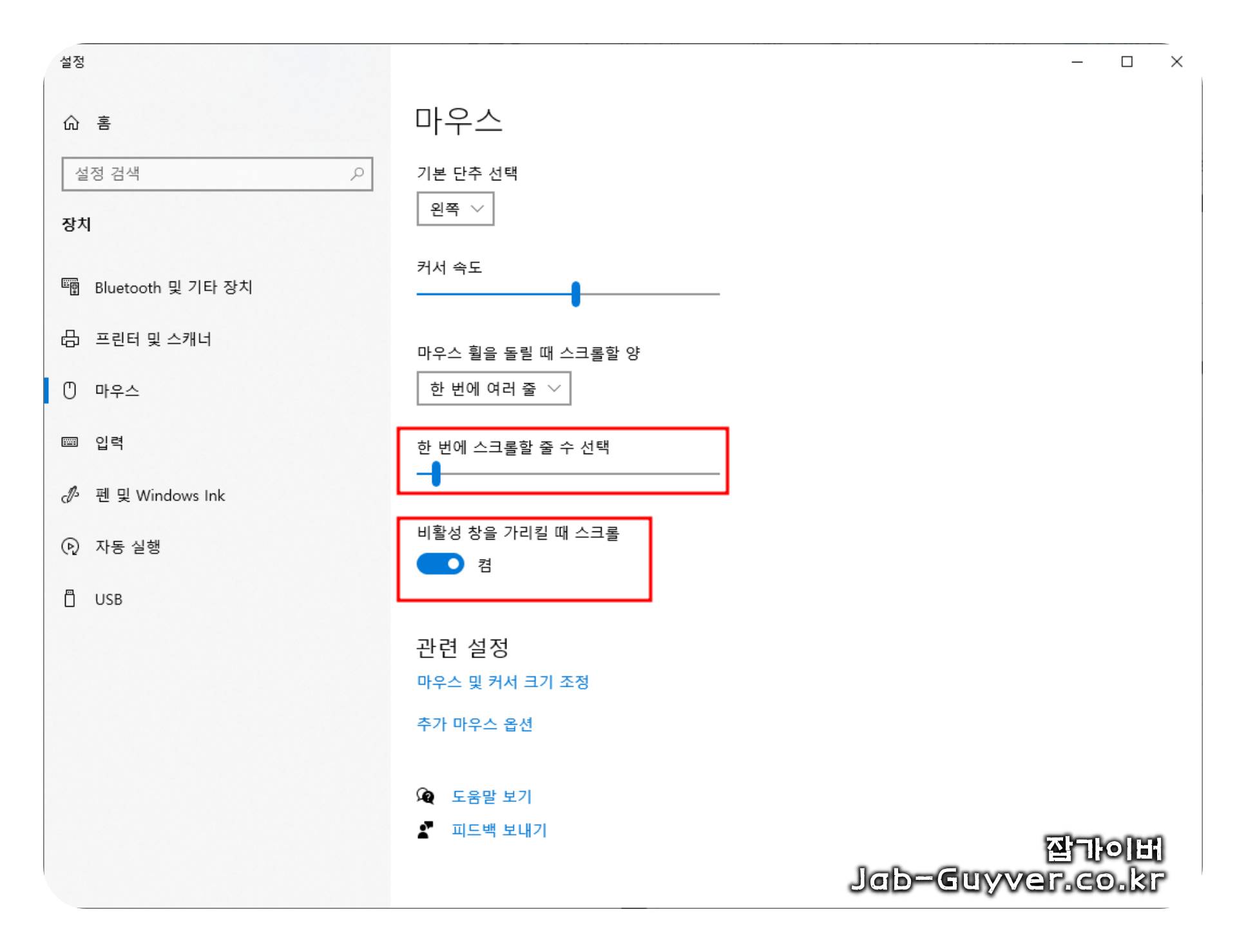 - "비활성 창에서 스크롤" 설정을 확인 및 조정.