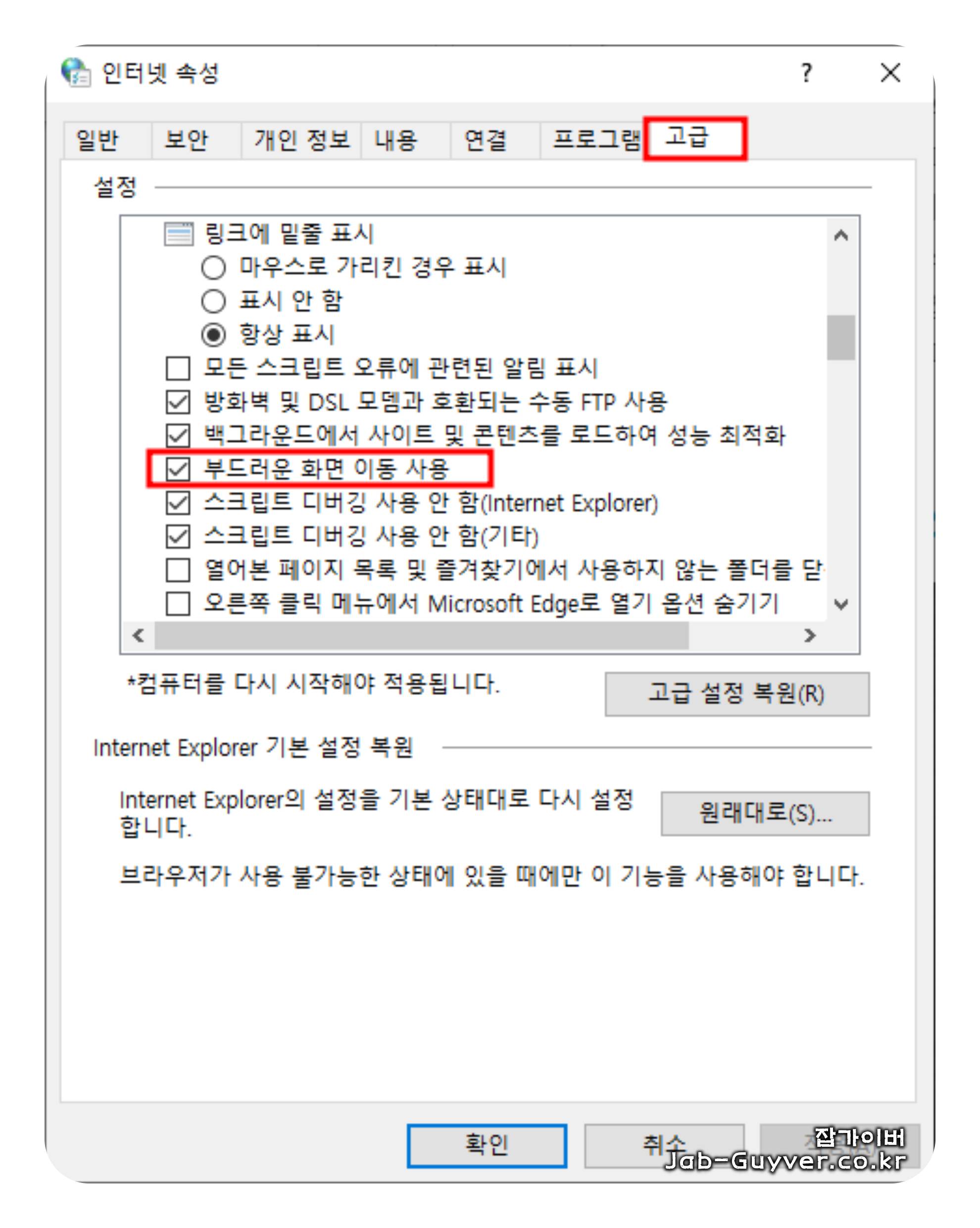 - 고급 탭에서 "부드러운 화면 이동 사용" 항목 체크 해제.