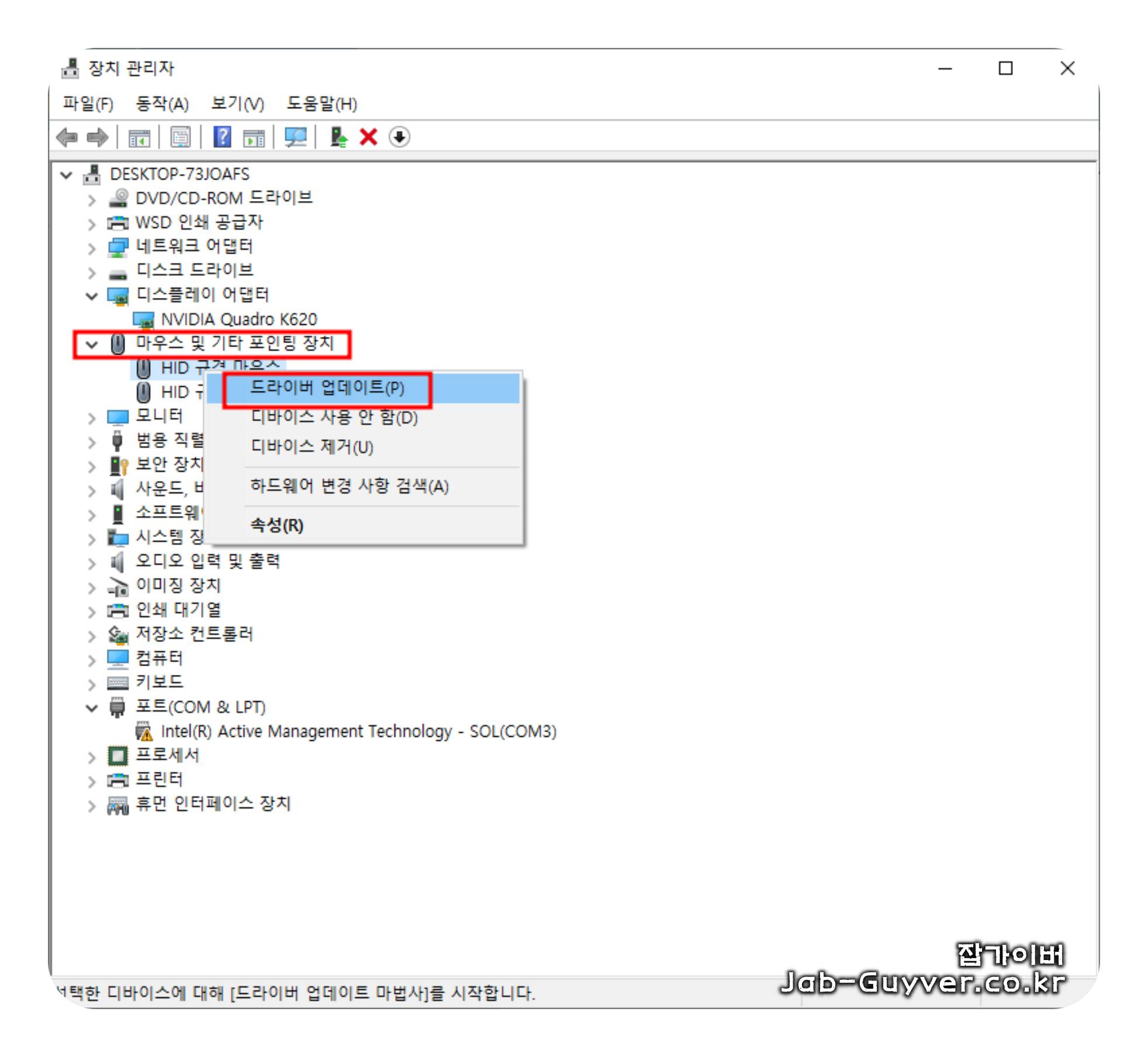 - 제어판 > 장치 관리자 > 마우스 및 기타 포인팅 장치 선택.