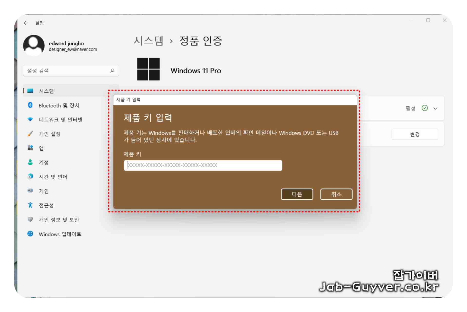 - 설치 과정에서 제품키를 입력하는 단계에서 윈도우11 제품키를 입력합니다.