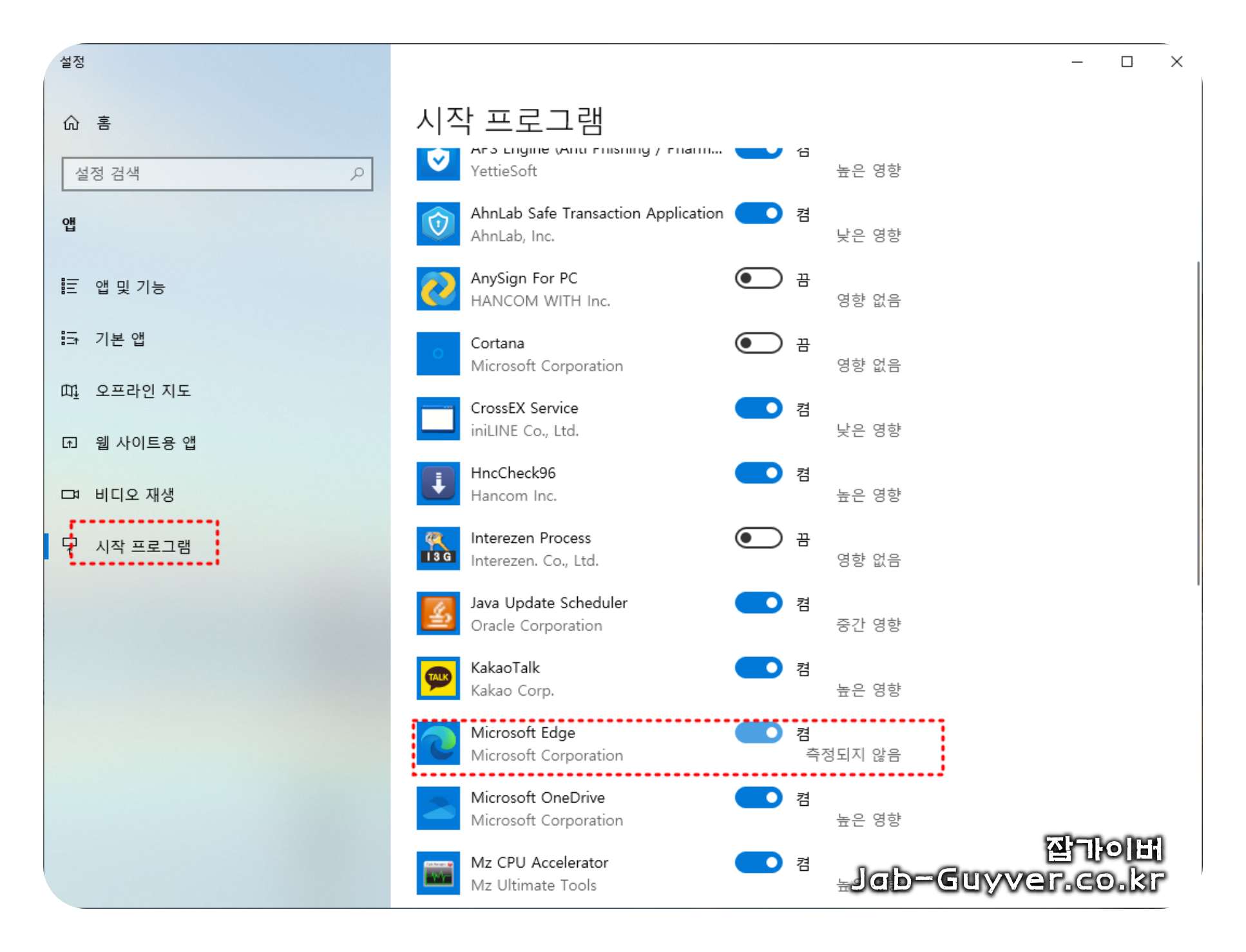 저 같은 경우 시작프로그램에서 Microsoft Edge과 컴퓨터 부팅 시 자동으로 실행되게 체크되어 있습니다.