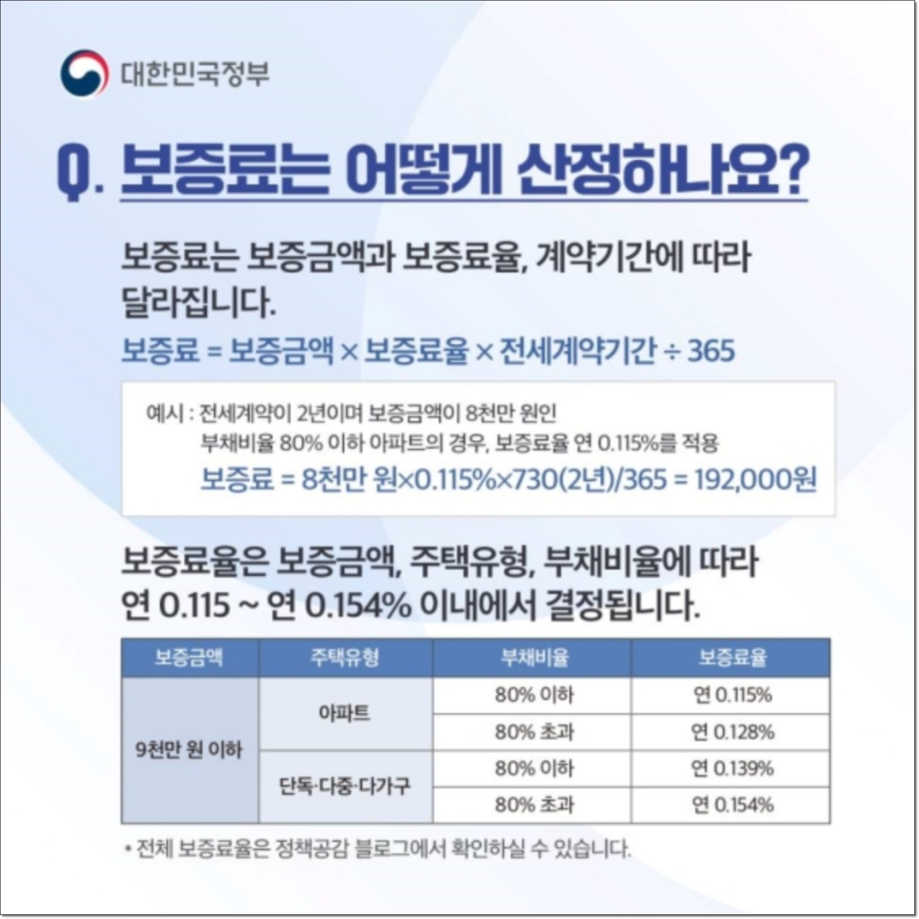 보증료는 보증금액과 보증료율, 계약 기간에 따라 달라집니다. 보증료율은 보증금액, 주택 유형, 부채비율에 따라 연 0.115 ~ 연 0.154% 이내에서 결정됩니다.