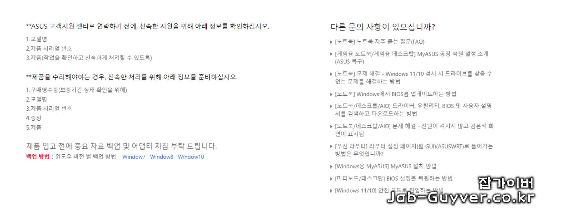 - 기술지원센터 연락: 아수스 고객센터(1588-3003)에 연락하여 기술 지원을 받으세요. 전문 엔지니어가 문제점을 확인하고 필요한 조치를 안내해줍니다.
