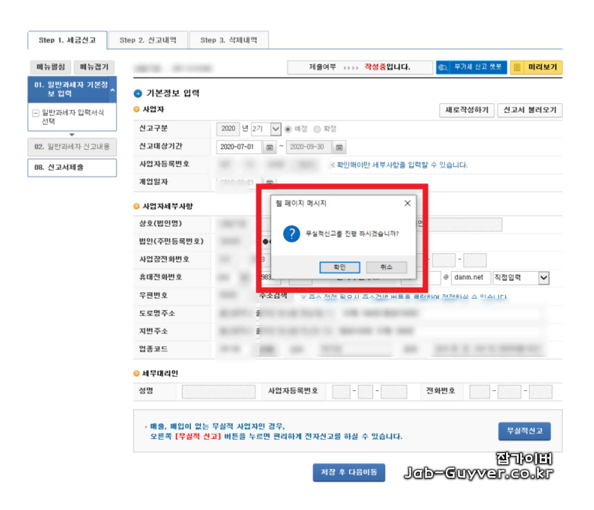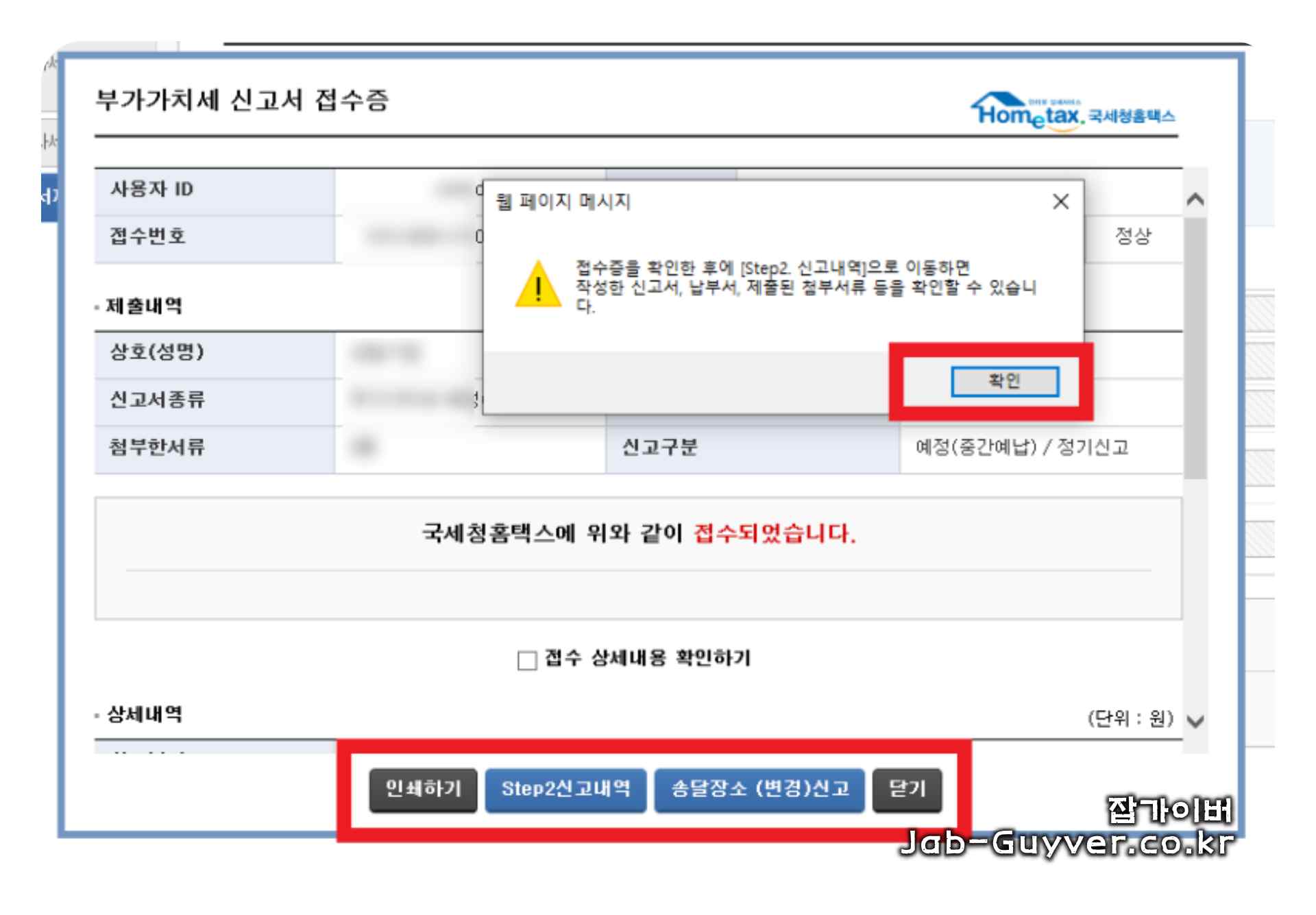 현재 예정신고 기간이라면 팝업이 하나 뜹니다. 확정 시에는 뜨지 않습니다.