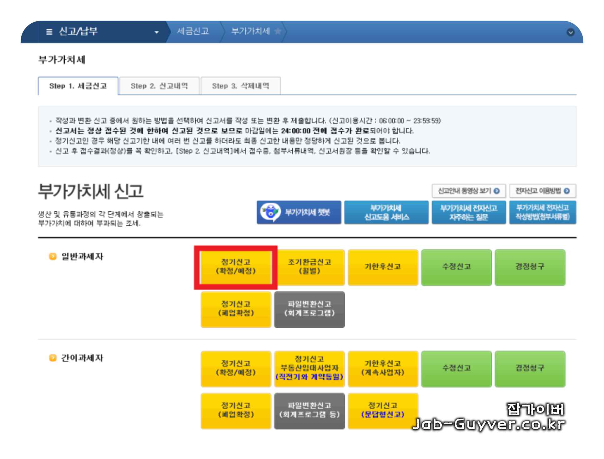 | 3단계 | [부가가치세] 항목에서 [정기신고(확정/예정)] 선택 |