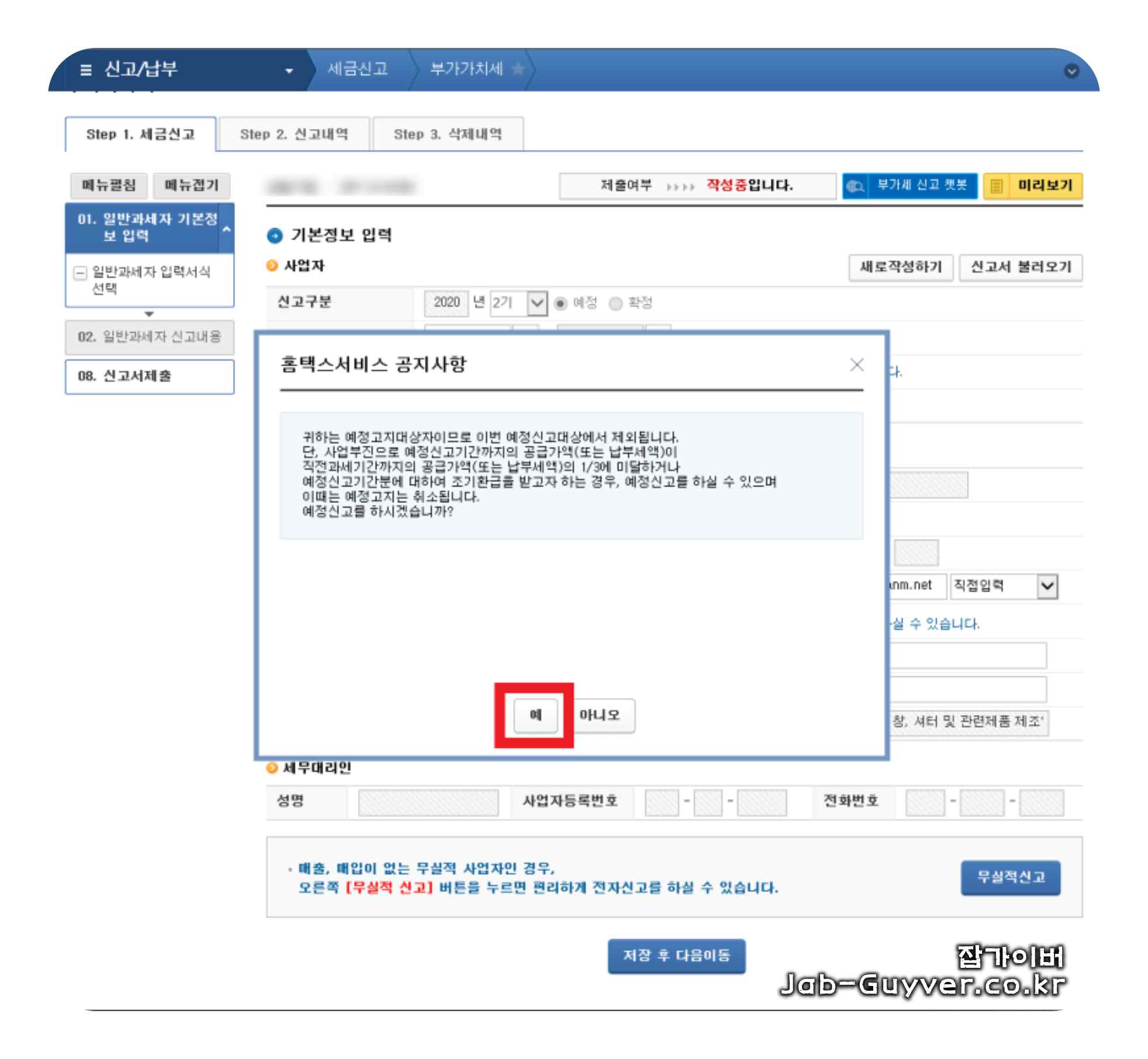 5. 하지만 사업부진으로 예정신고기간까지의 공급가액(또는 납부세액)이 직전과세기간까지의 공급가액(또는 납부세액)의 1/3에 미달하거나 예정신고기간분에 대하여 조기환급을 받고자 하는 경우, 예정신고를 할 수 있으며 이때는 예정고지는 취소됩니다. "예"를 클릭하시면 됩니다.