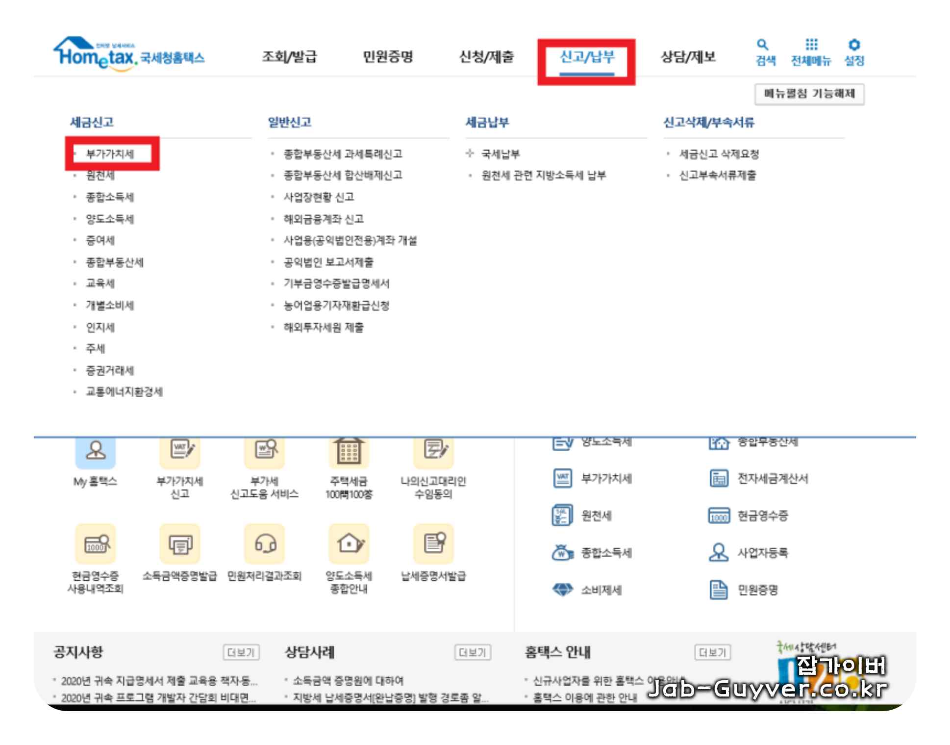 2. 신고/납부 메뉴에서 부가가치세를 선택합니다.
