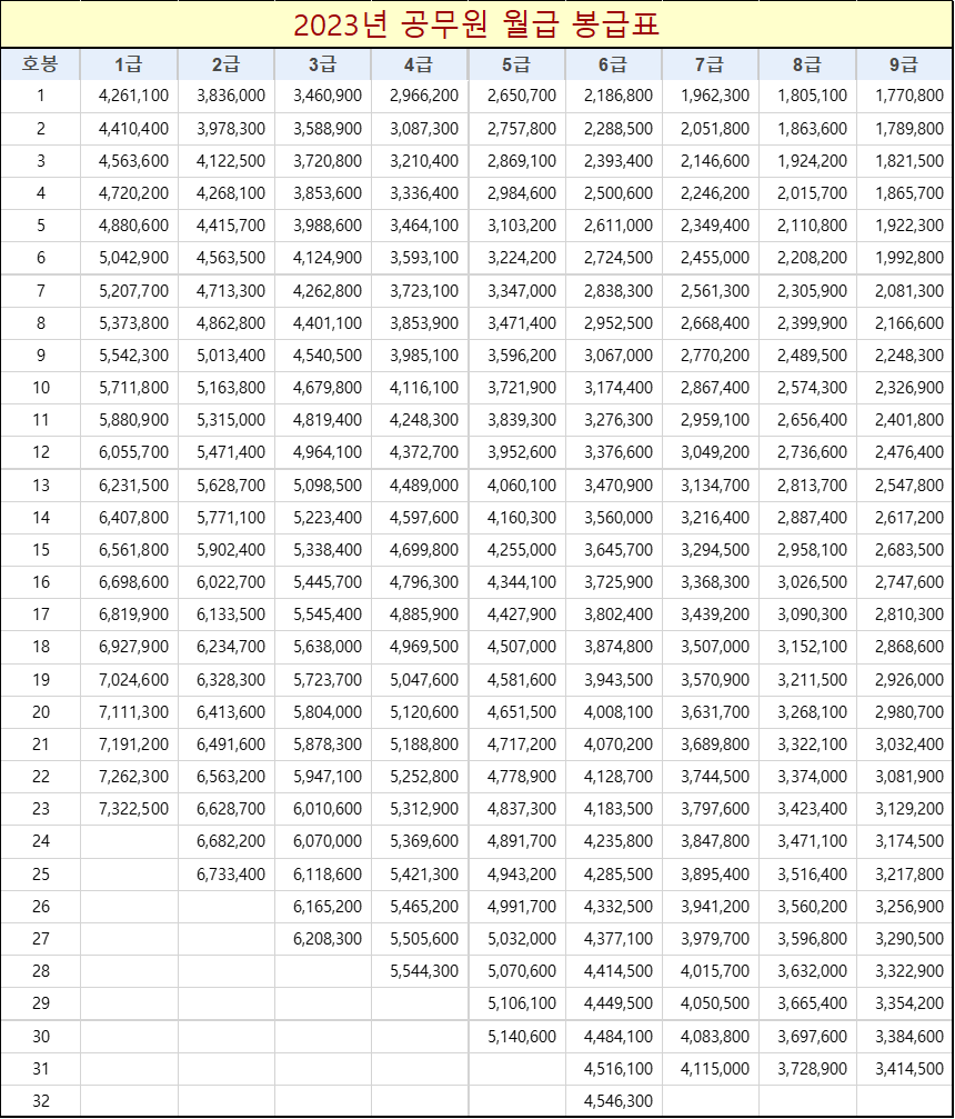 공무원연금이 줄고 있는 가운데 2023년 공무원의 9급 공무원부터 1급까지의 1호봉부터 32호봉까지의 월급을 알아보겠습니다.