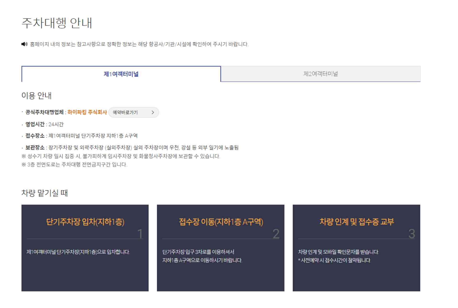 제1여객터미널과 제2여객터미널에 따라 다른 주차대행 서비스 업체를 이용하며, 해당 업체에서 서비스 접수가 가능한 장소를 확인하시기 바랍니다.