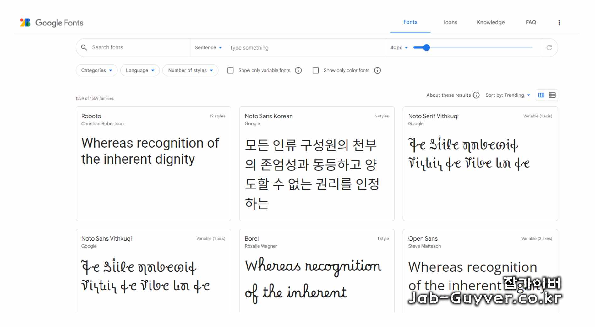 | 구글 폰트 (Google Fonts) | 영문/한글 | 전 세계에서 가장 널리 사용되는 무료 폰트 사이트 웹 폰트로 쉽게 사용 가능 다국어 지원 |
