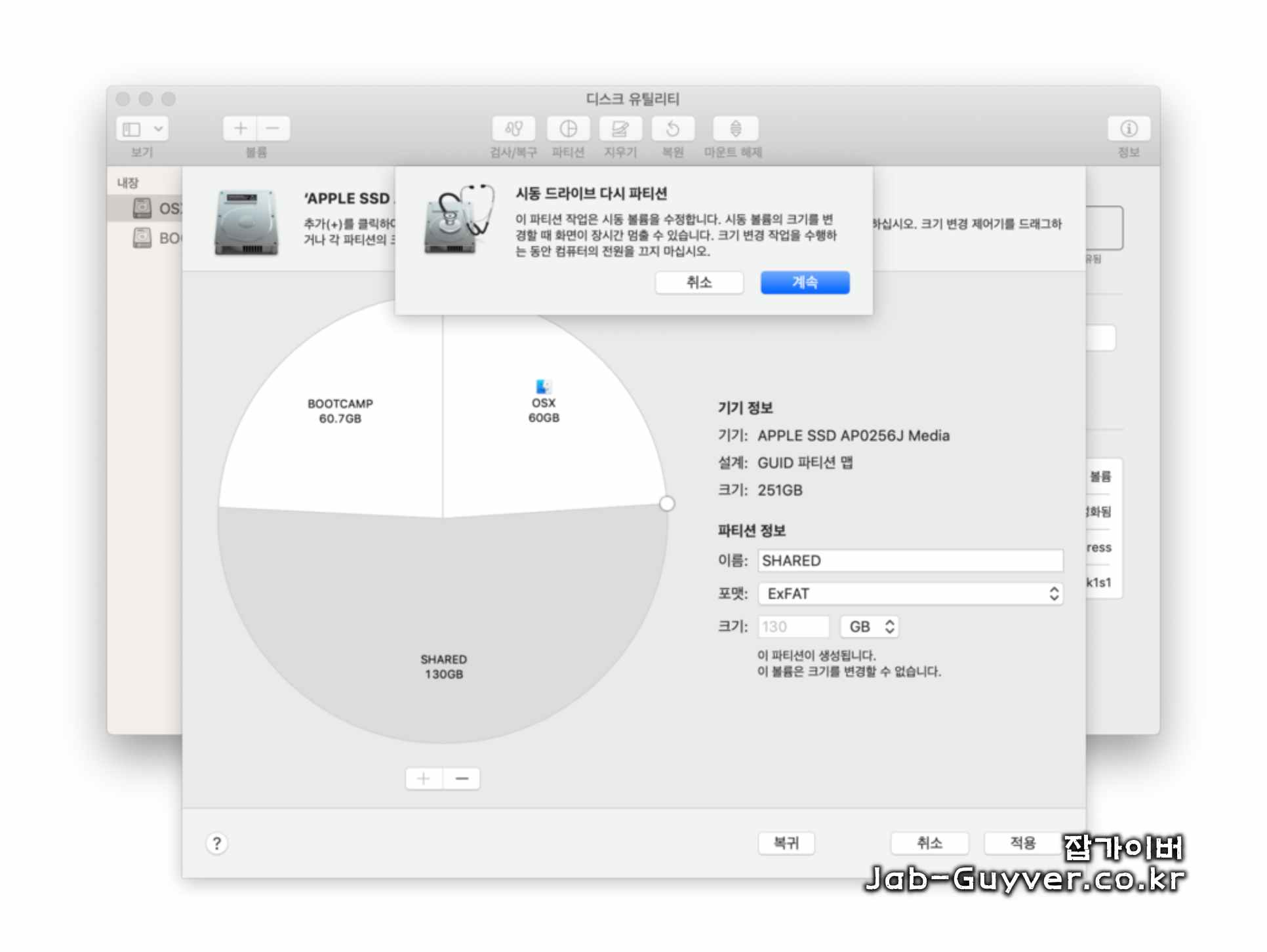 맥북의 파일 시스템에 발생한 오류로 인해, 파티션 생성이나 파일 복사 과정에서 문제가 발생할 수 있습니다.