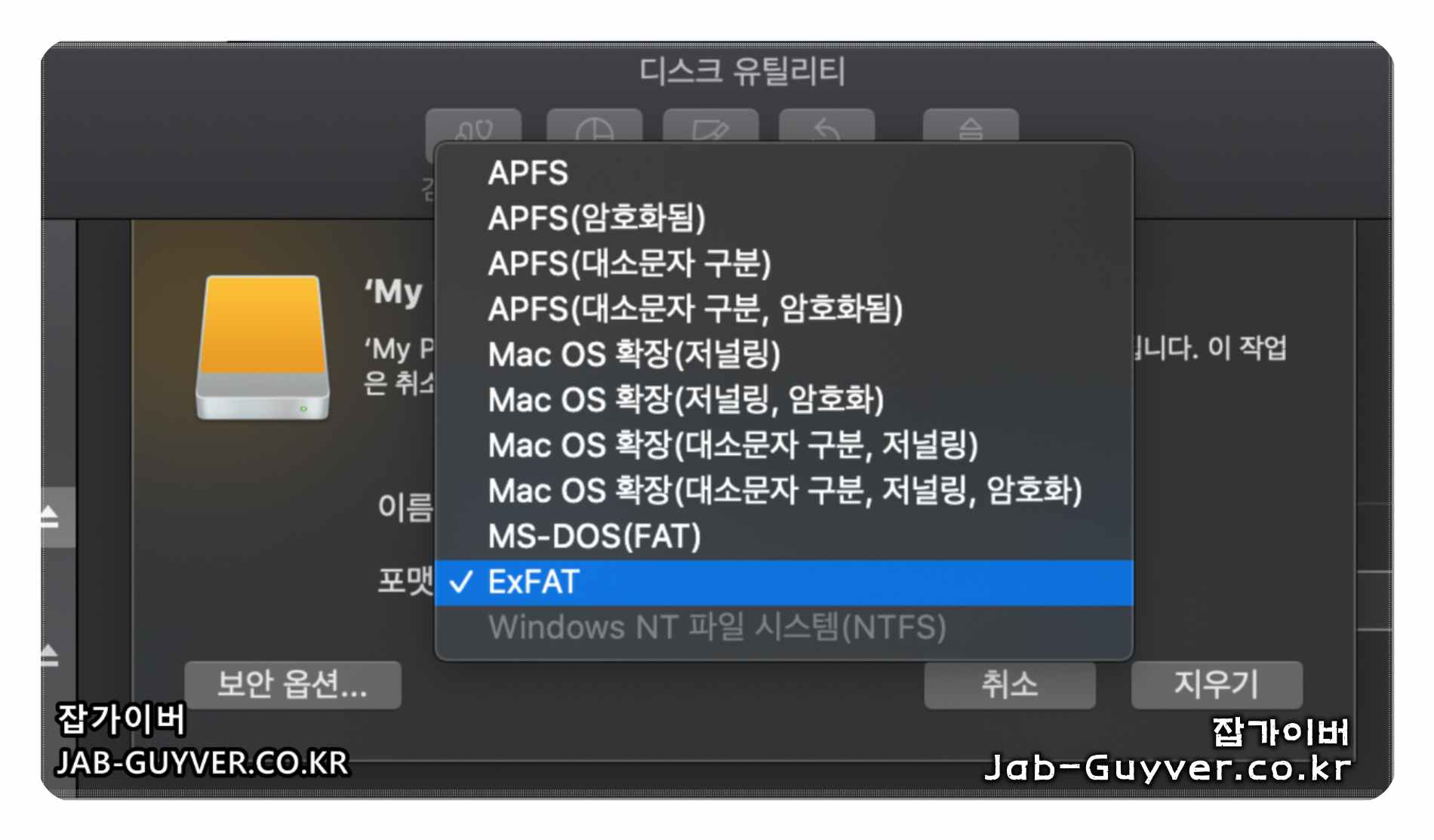 • macOS Extended: 맥의 기본 파일 시스템으로 윈도우에서는 읽기만 가능하고 쓰기가 불가능합니다.