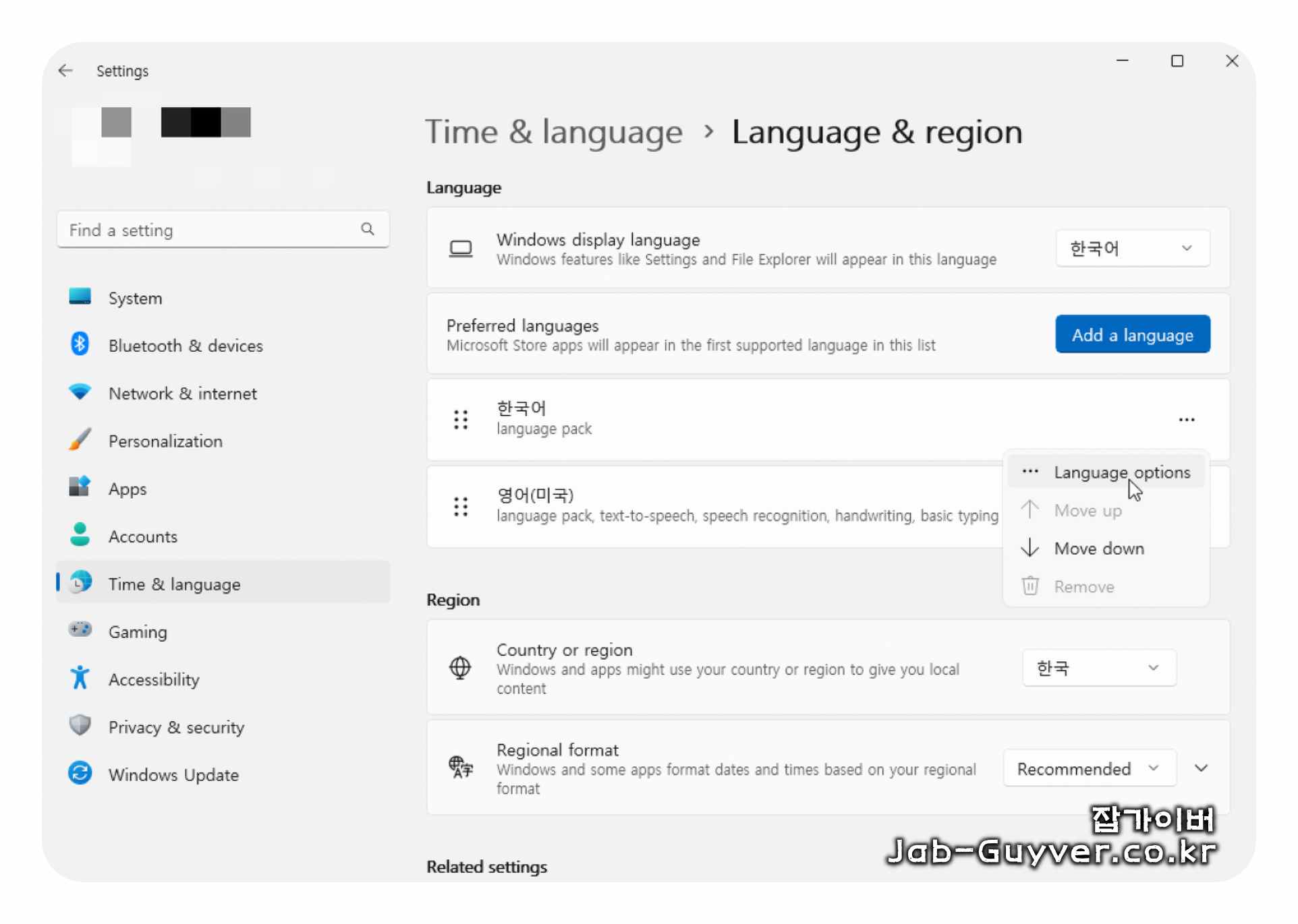 Windows 설치가 완료되면 필요한 설정(언어, 계정 등)을 마무리하고 Windows를 사용할 준비가 되며 만약 언어가 한글이 아니라면 한글 언어팩 및 키보드 설정을 다시 재설정합니다.