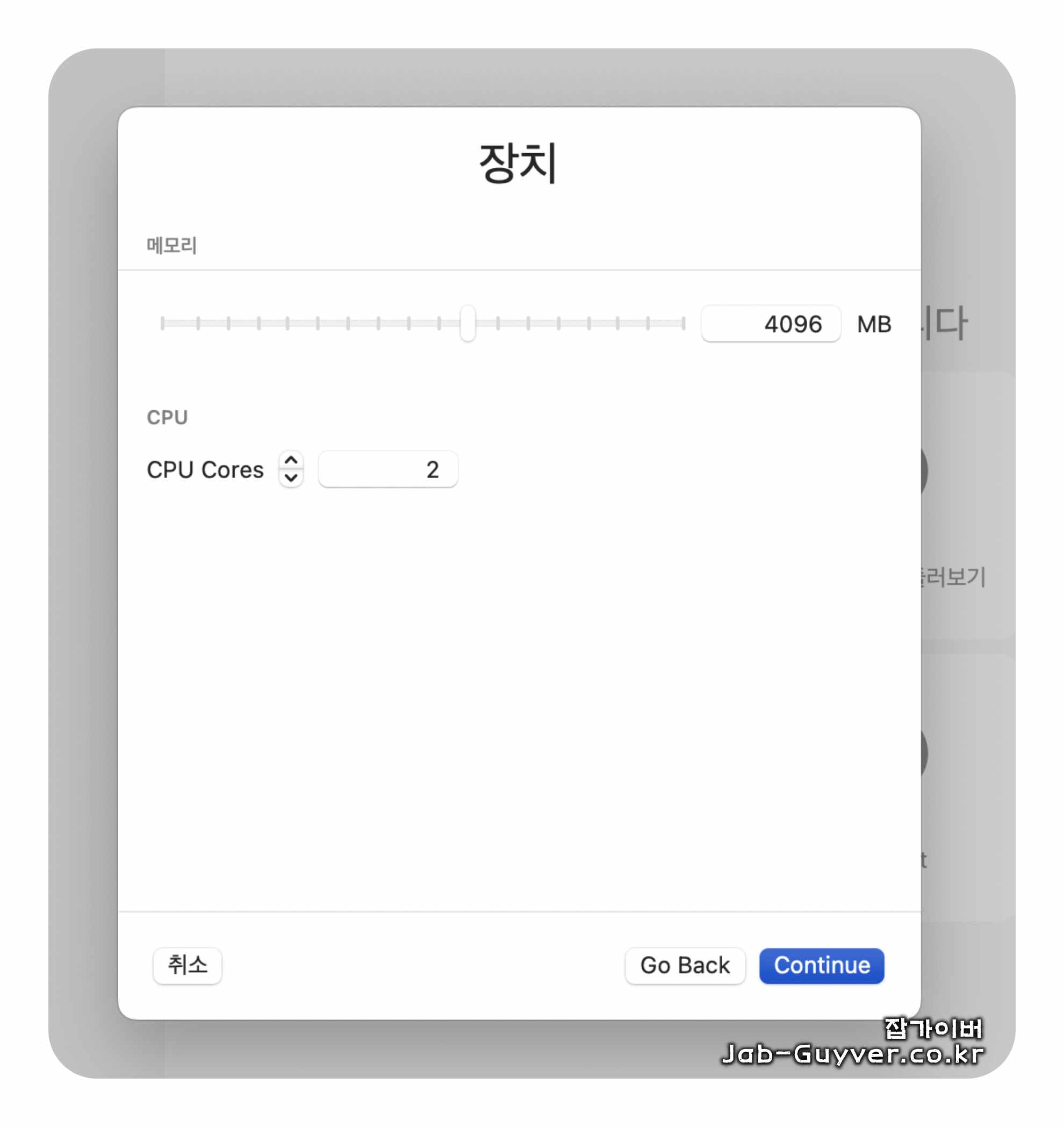 메모리 및 CPU 코어 수를 조절하여 가상 머신의 성능을 조절할 수 있으며 사용하고 있는 맥의 M1/M2 칩셋은 많은 리소스를 가지고 있으므로 적당한 크기를 선택하는 것이 좋습니다.