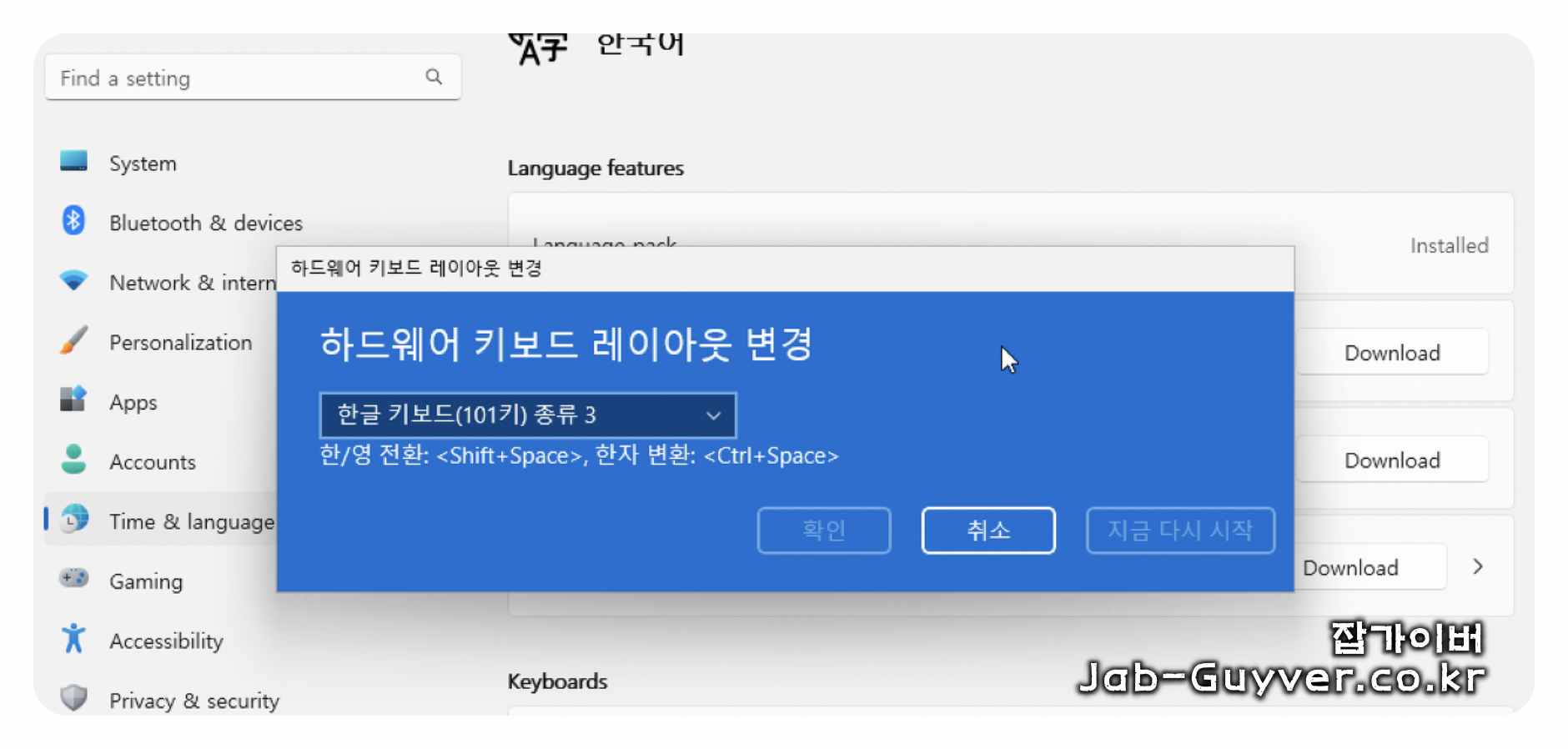 Windows 설치가 완료되면 필요한 설정(언어, 계정 등)을 마무리하고 Windows를 사용할 준비가 되며 만약 언어가 한글이 아니라면 한글 언어팩 및 키보드 설정을 다시 재설정합니다.