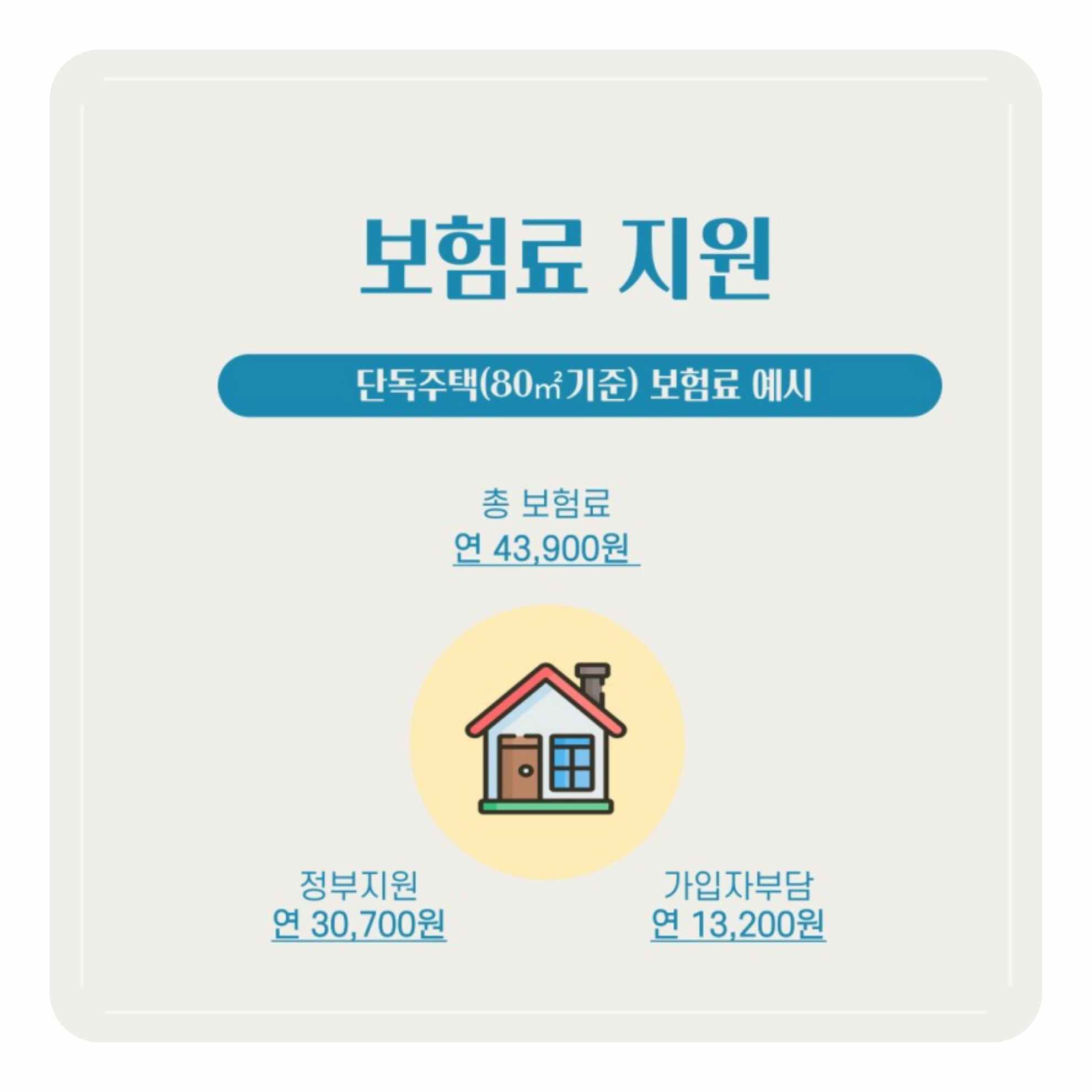 예를 들어, 주택의 경우 연간 보험료가 43,900원이라고 가정해보겠습니다. 이때 정부는 보험료의 70%에서 92%를 지원하며, 가입자는 남은 8%에서 30%를 부담합니다. 만약 정부의 지원률이 70%이고 가입자의 부담률이 30%일 경우, 가입자의 실제 부담액은 연 13,200원이 됩니다. 이런식으로 가입자의 경제적 부담을 줄여주는 구조입니다.